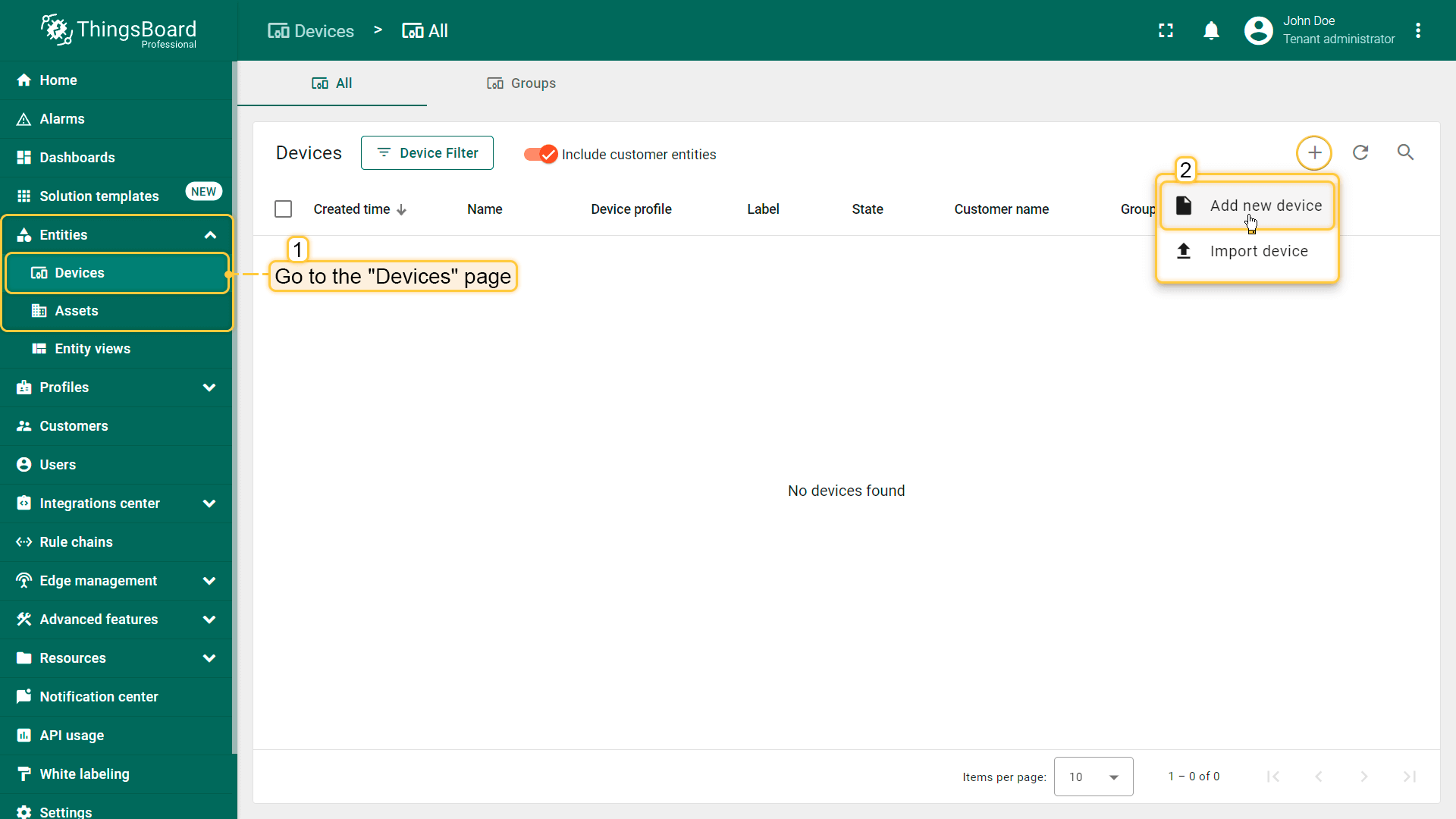 Go to the “Devices” page of the “Entities” section. By default, you navigate to the device group “All”. Click on the “+” icon in the top right corner of the table and then select “Add new device” from drop-down menu;