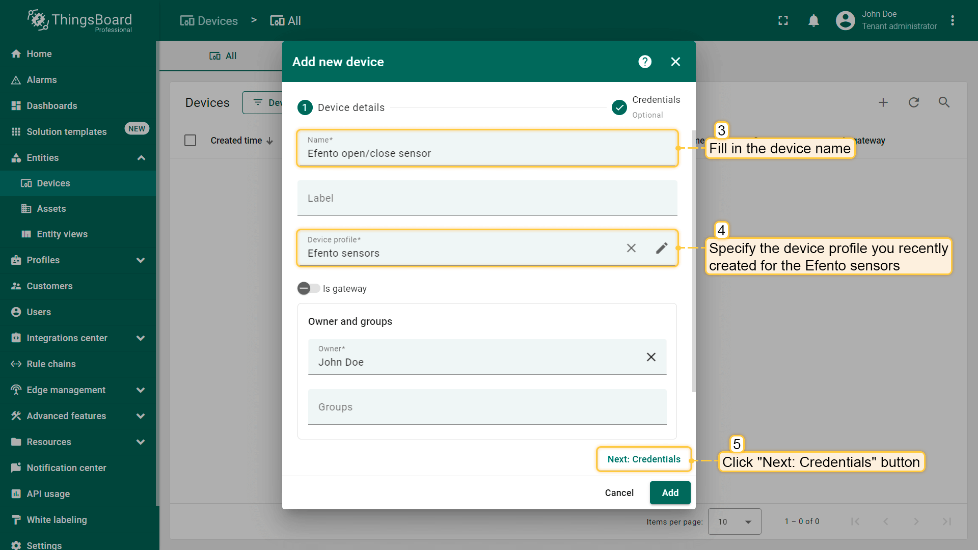 Enter the device name. In the “Device profile” field specify the profile you have recently created for Efento sensors. Then, click “Next: Credentials” button;