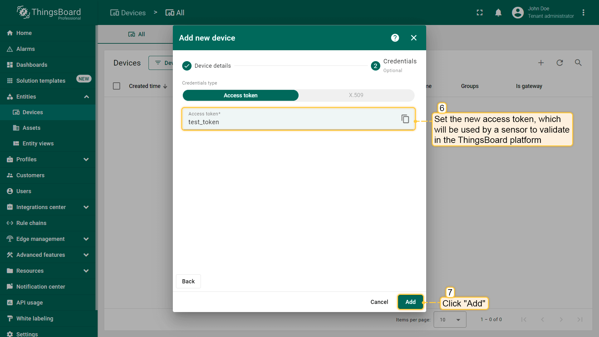 Leave the credential type as “Access token”. Set the new access token, which will be used by a sensor to validate in the IoT Hub platform. Note that the token must be unique for each sensor. Configuration of the token is optional. Click “Add” button to confirm adding new device;