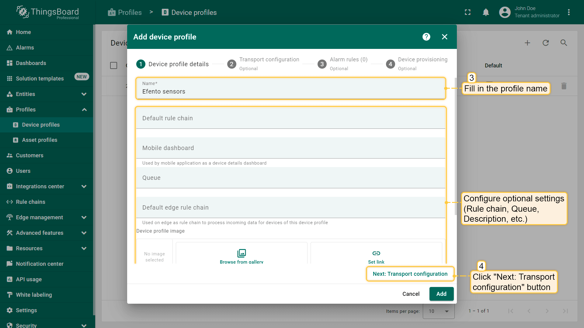 Log in to your administrator account and navigate to “Device profiles” page. Click on the “+” icon in the top right corner of the table and then select “Create new device profile” from drop-down menu;