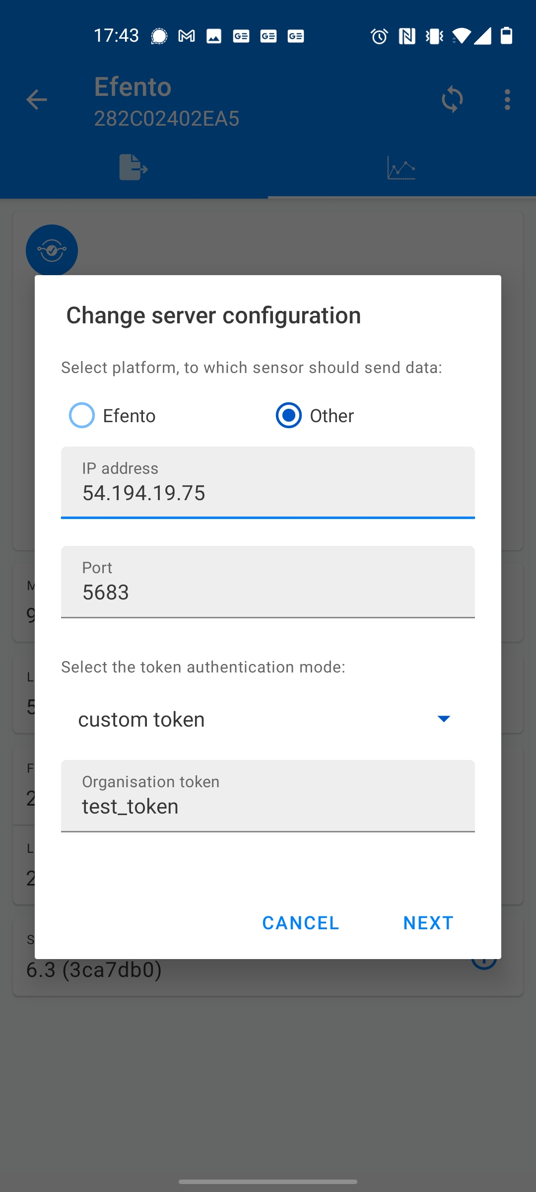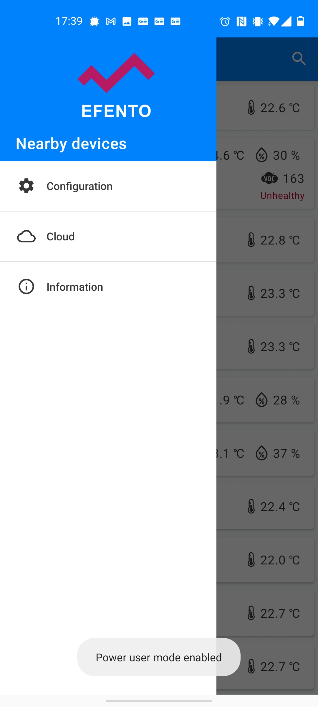 Once you download and install the application select “Nearby sensors” mode and unlock the power user mode: open the application menu and quickly tap Efento logo five times.