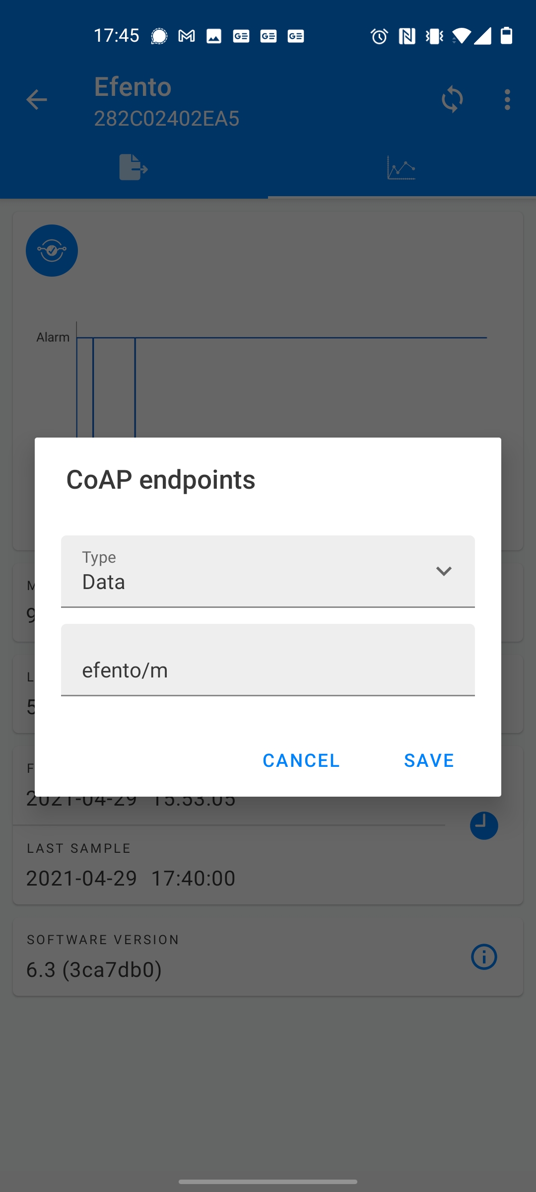 Set the CoAP endpoints, to which the sensor will send the data. Click on the menu (three dots in the upper right corner) -> Power user -> CoAP endpoints. Set the endpoints to the following values: