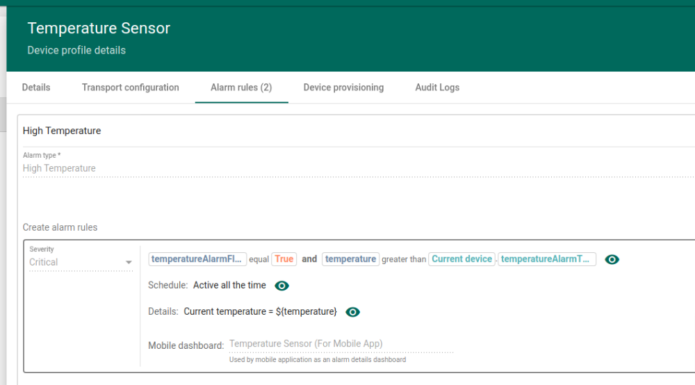 IoT Hub allows configuring alarm details dashboard to be displayed when tapping on the alarm in the alarms screen. Alarm details dashboard is configurable in the alarm rules of the device profile form:
