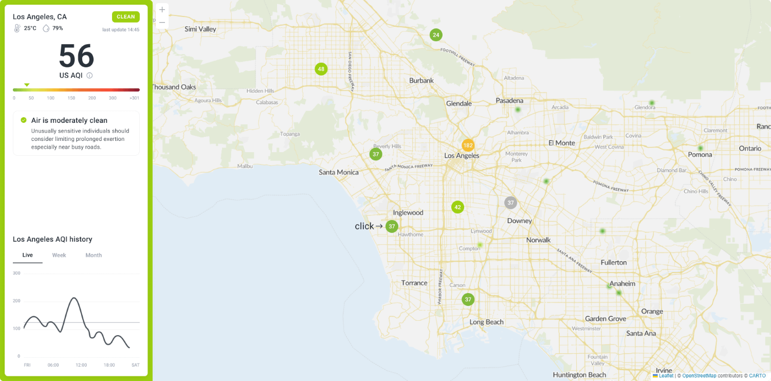 • work with an Interactive map of air pollution monitoring stations with color-coded markers which are depending on the AQI level;