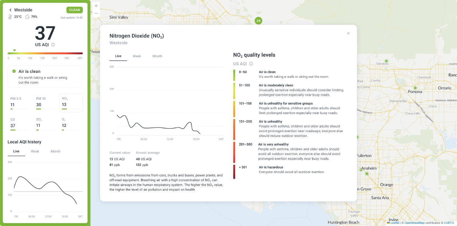 • observe a section of specific pollutants: PM2.5, PM10, NO2, CO, SO2, and O3. Click on one of these tiles, and a pop-up will appear, which will display a description, general recommendations, as well as its statistics for this pollutant.