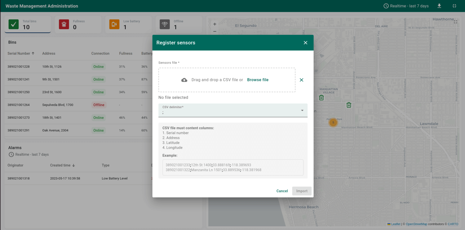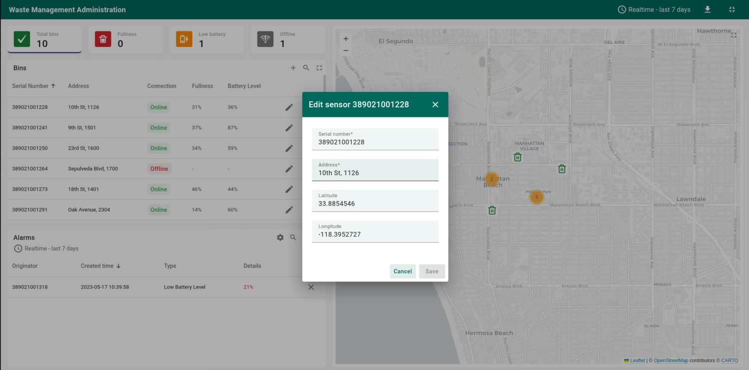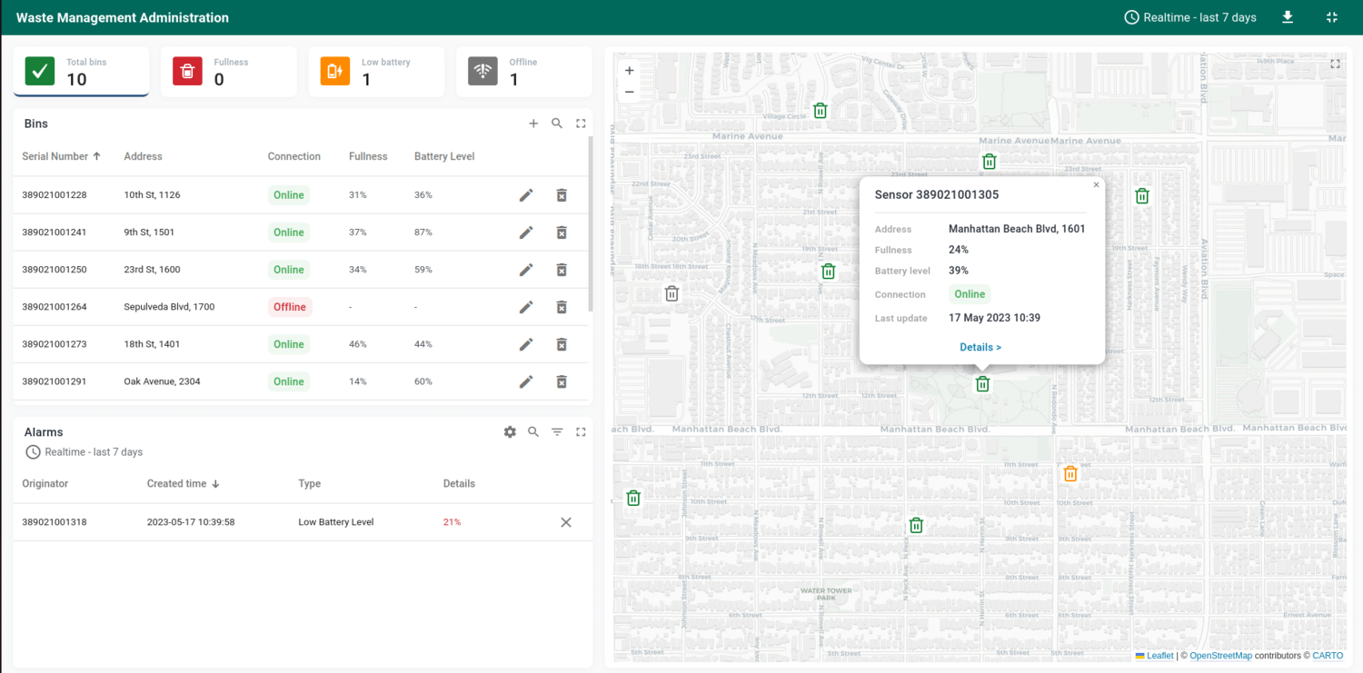 As part of this solution, we have created the Waste Management Administration dashboard that displays data from waste sensors.