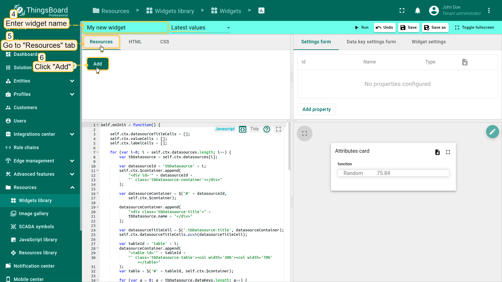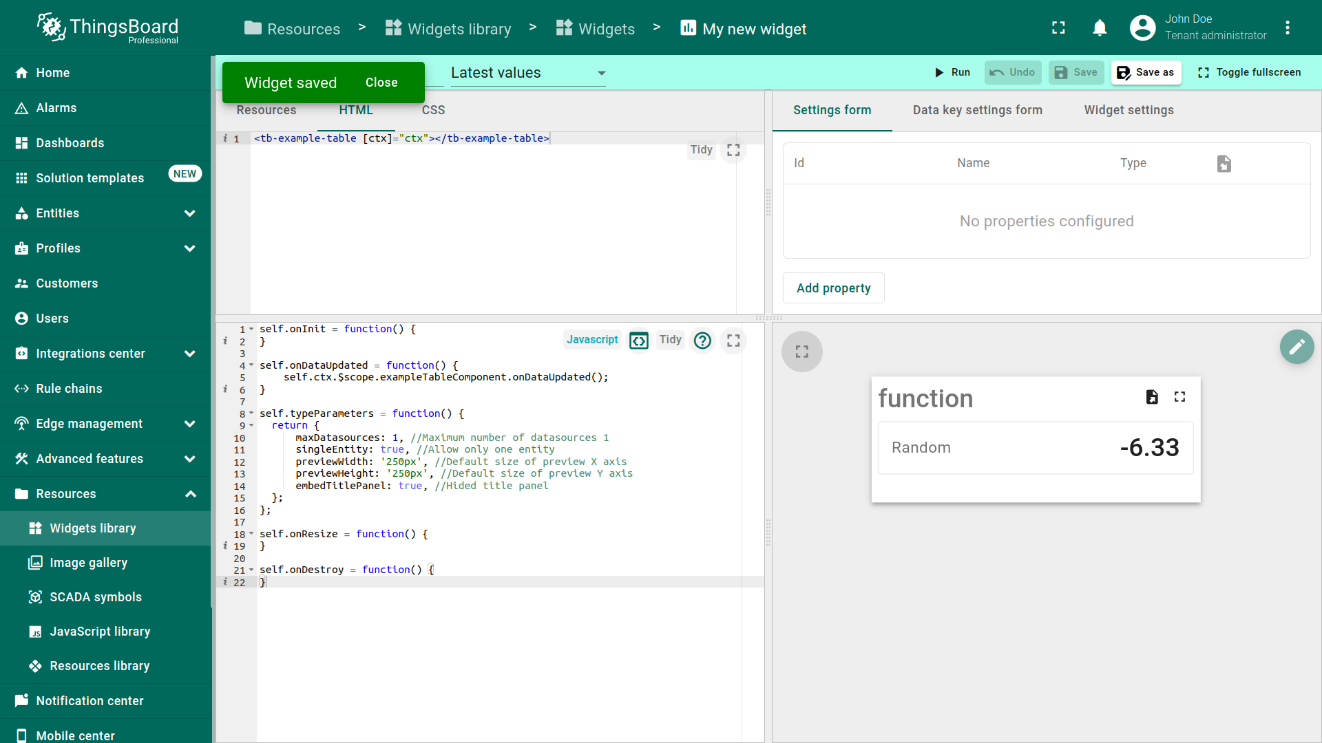 In the Widgets Bundle view, click the big “+” button at the bottom-right part of the screen, then click the “Create new widget type” button. Click the Latest Values button on the Select widget type pop-up. The Widget Editor will be opened, pre-populated with the content of default Latest Values template widget.