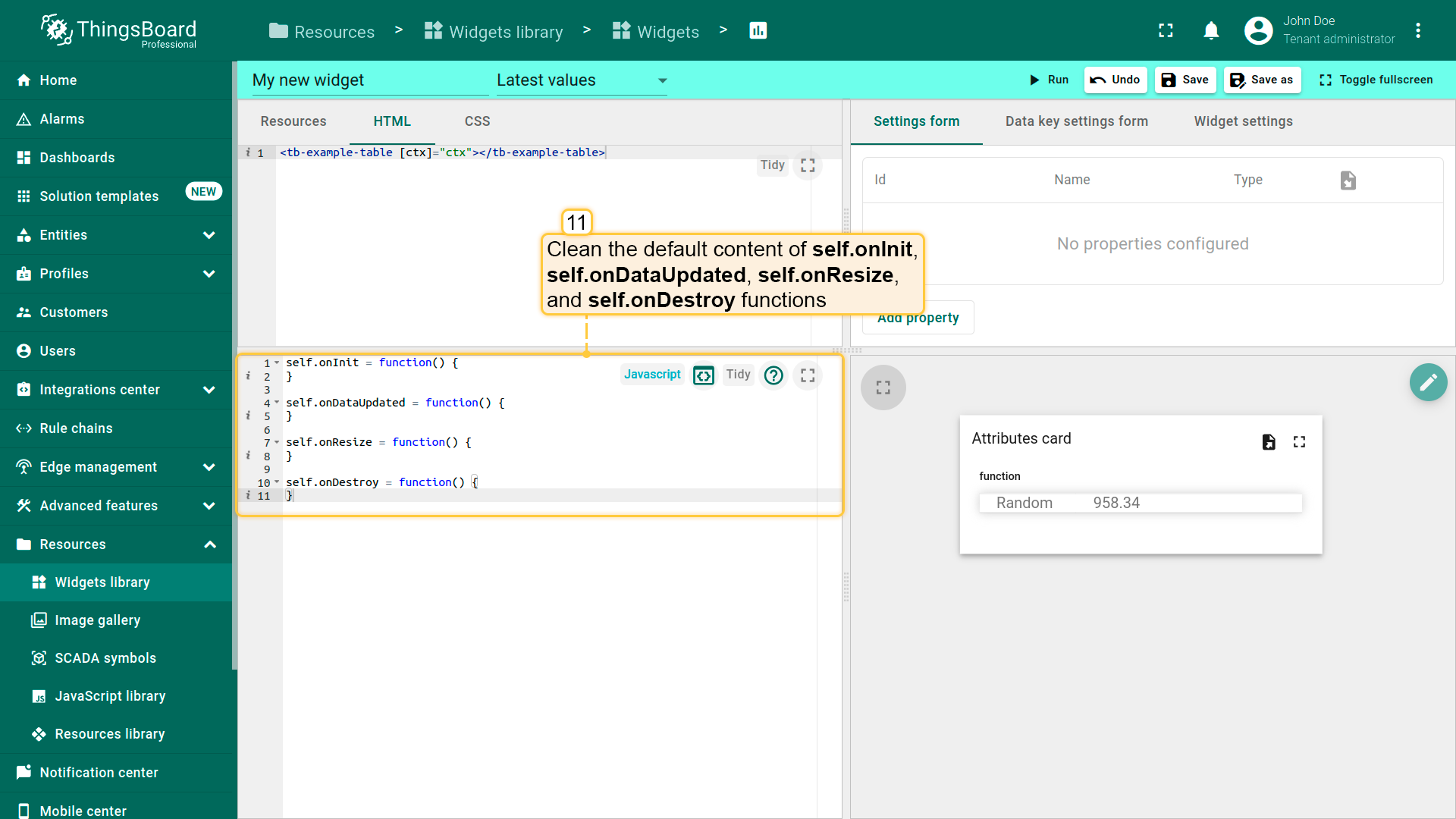 • Clean the default content of self.onInit, self.onDataUpdated, self.onResize functions;