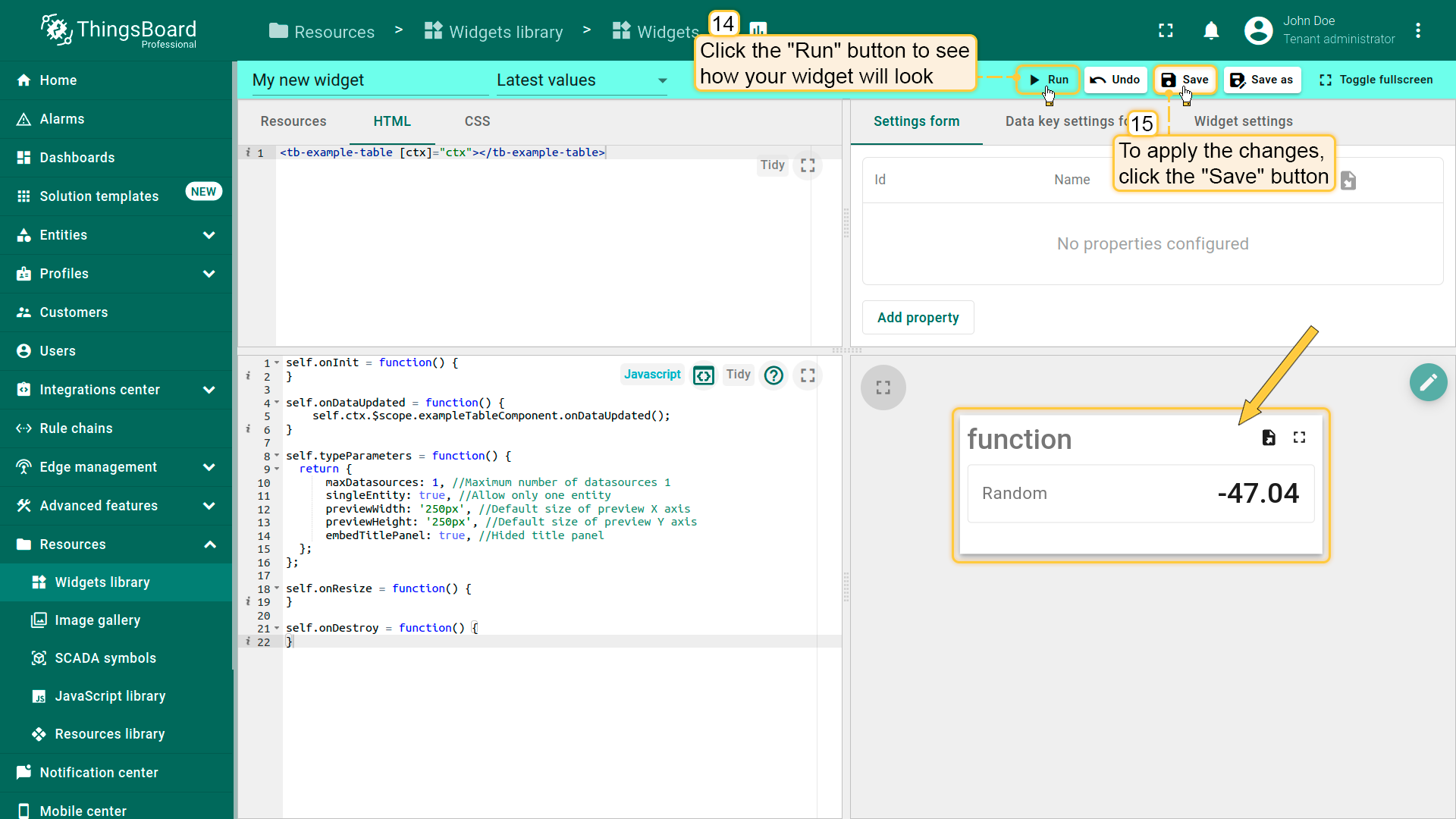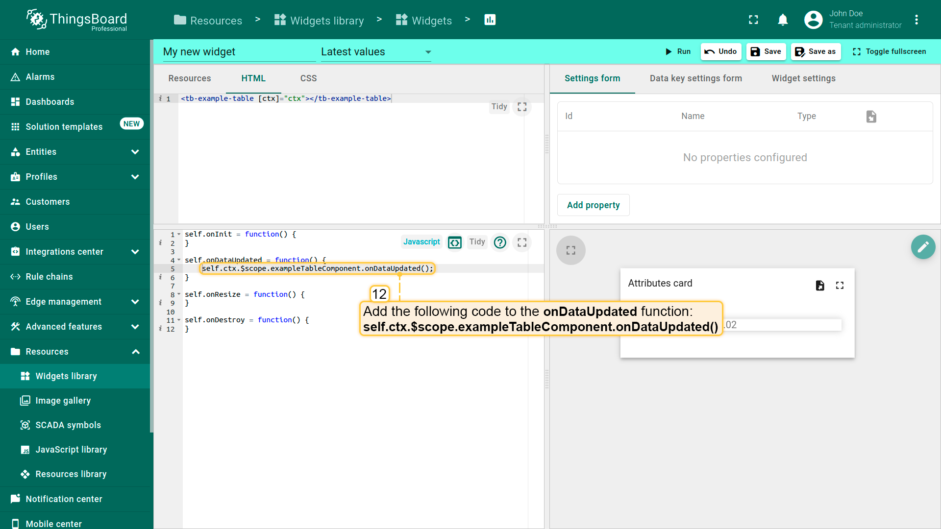 • Go to the “HTML” tab, and add the custom component. In our case it will be tb-example-table (don’t forget to add ctx);