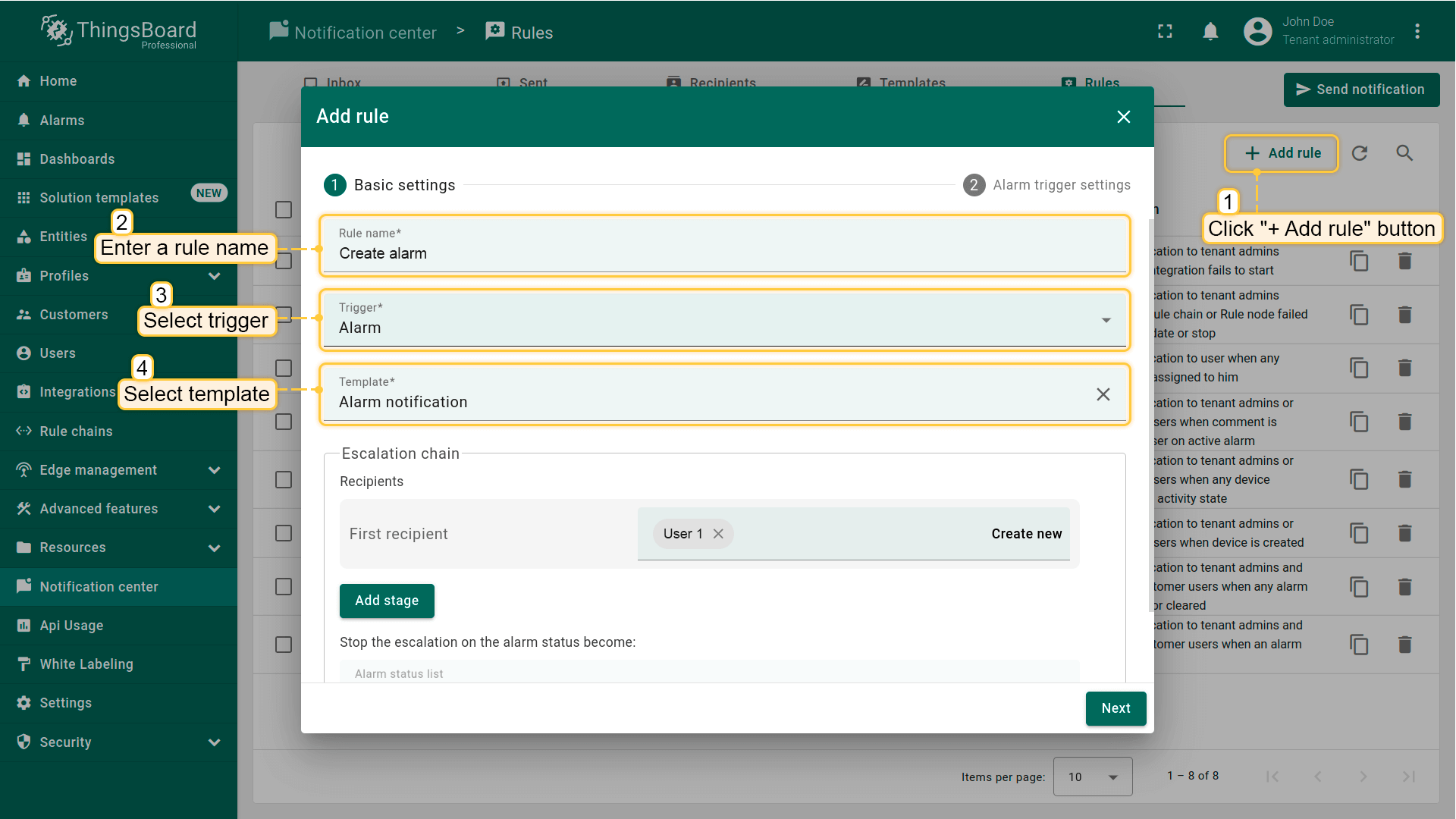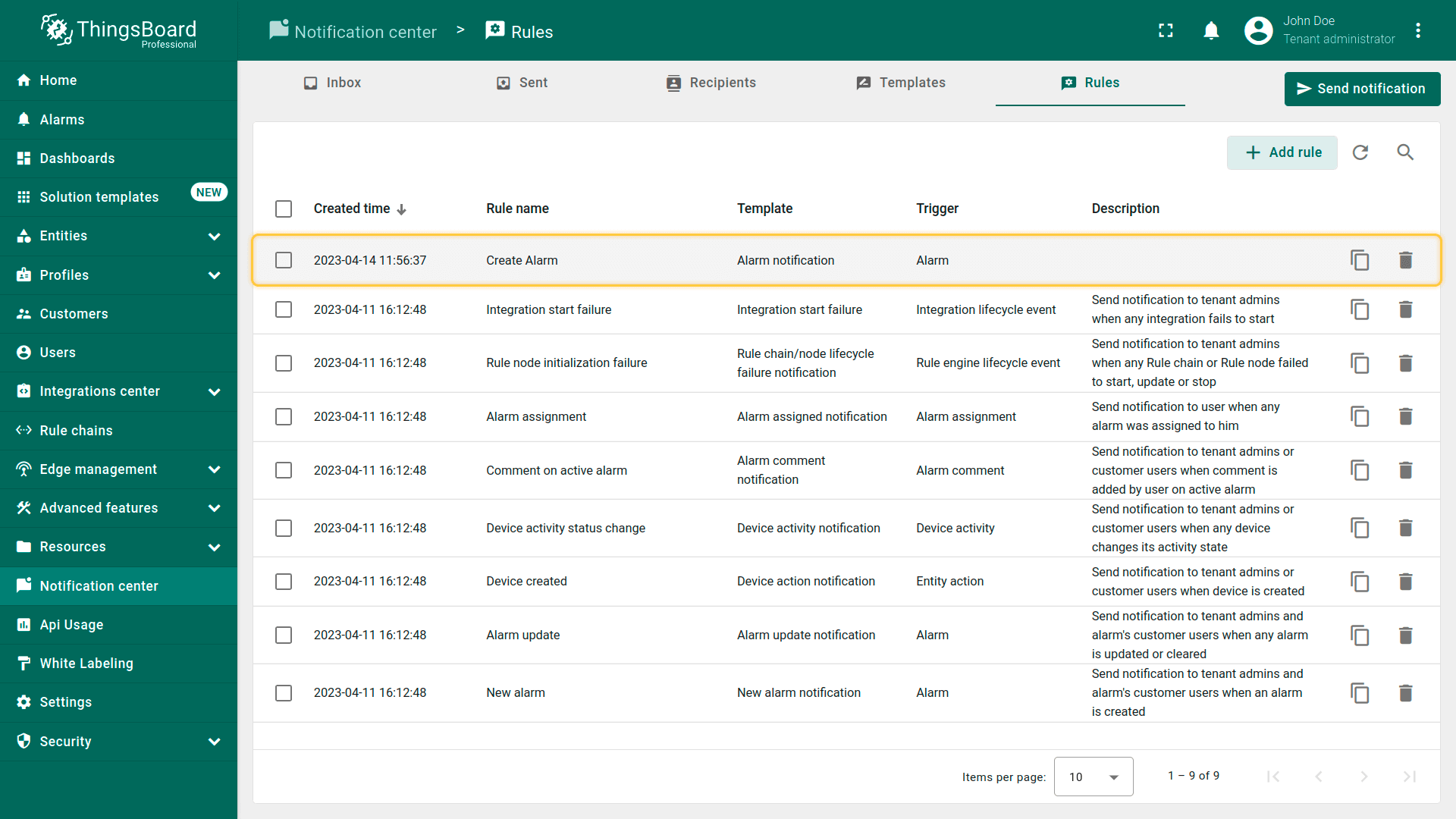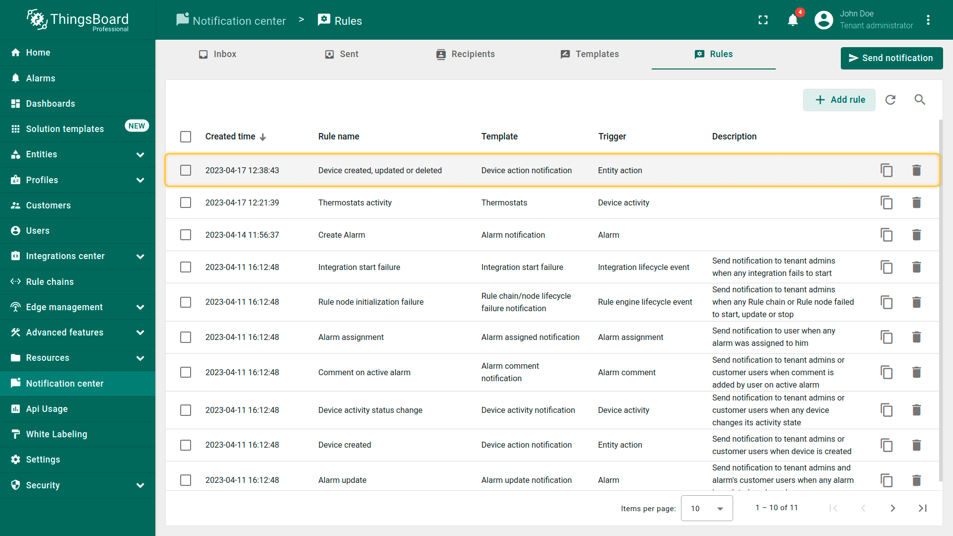 The default rule ‘Device created’ will notify tenant administrators when device is created.