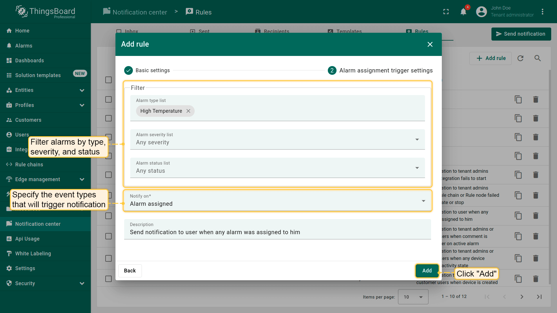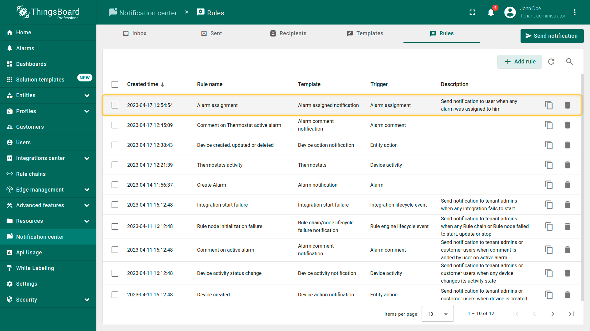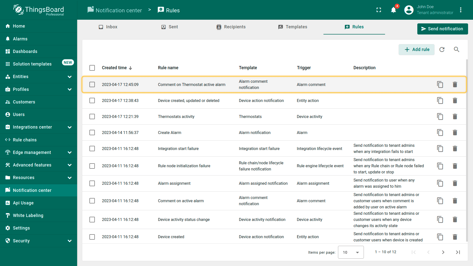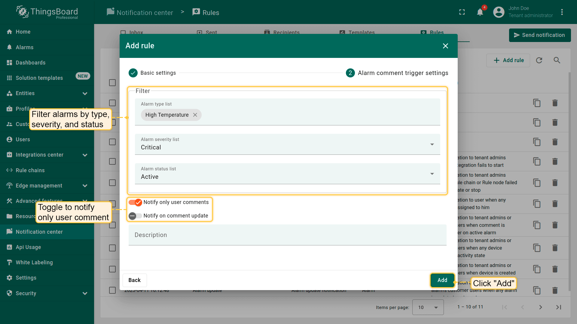 The default rule ‘Comment on active alarm’ will notify tenant administrators when comment is added by user on active alarm.