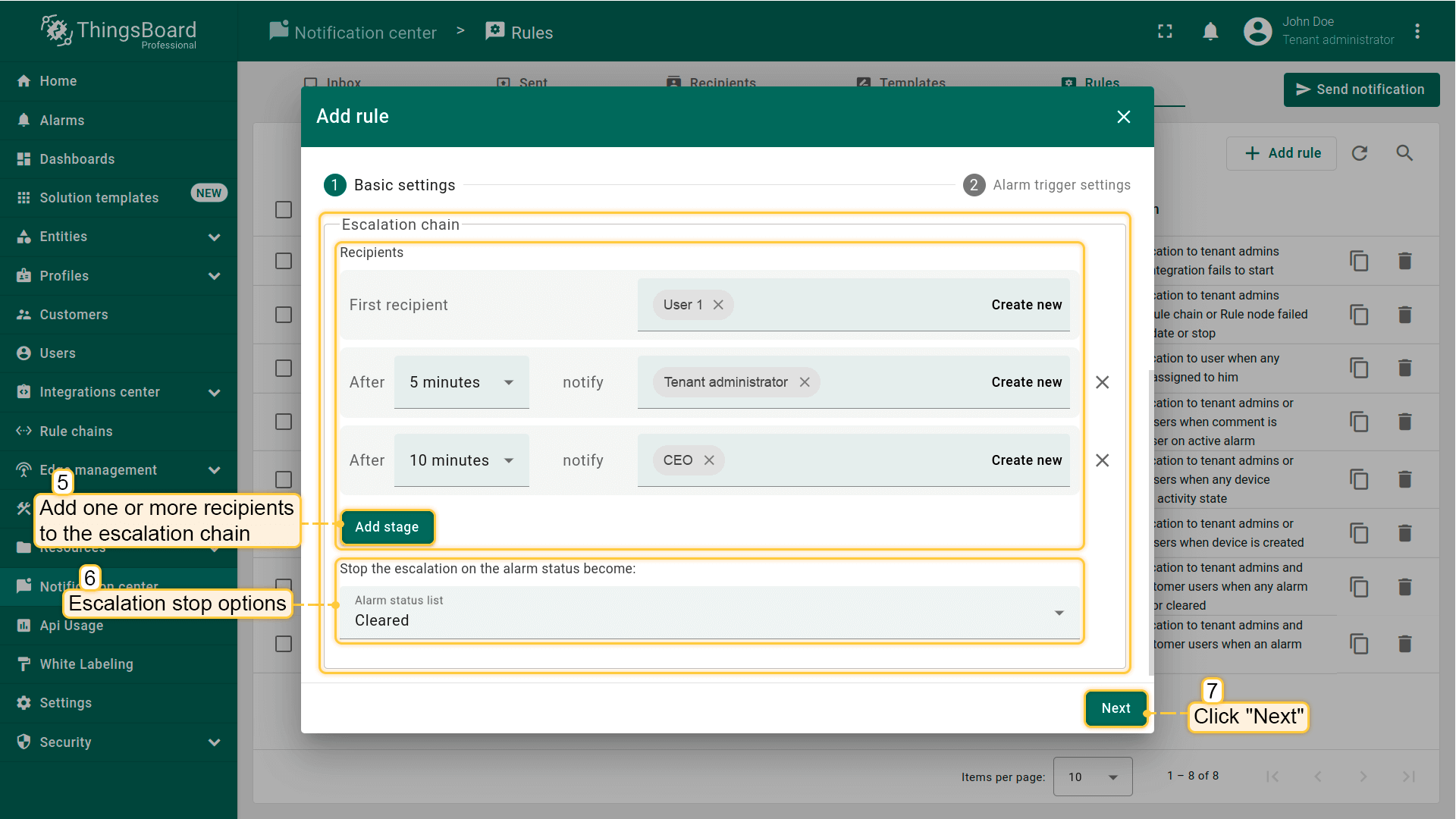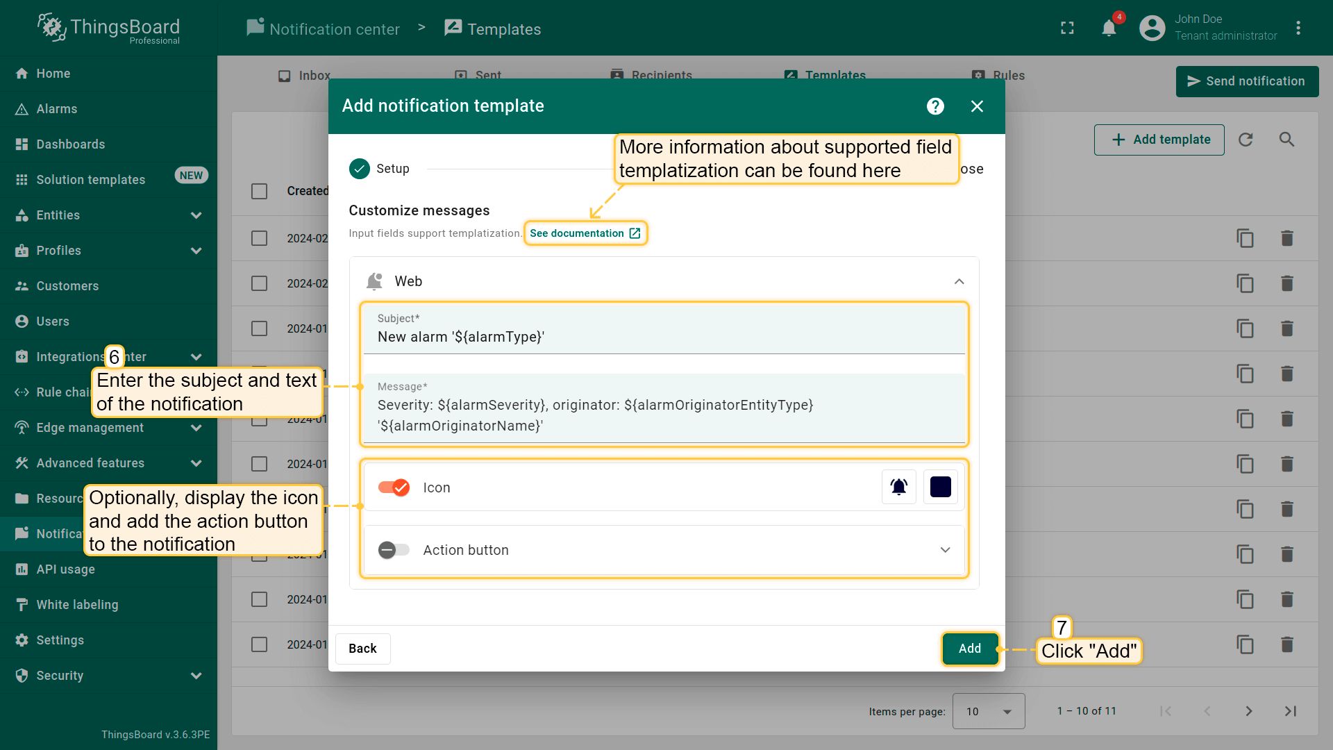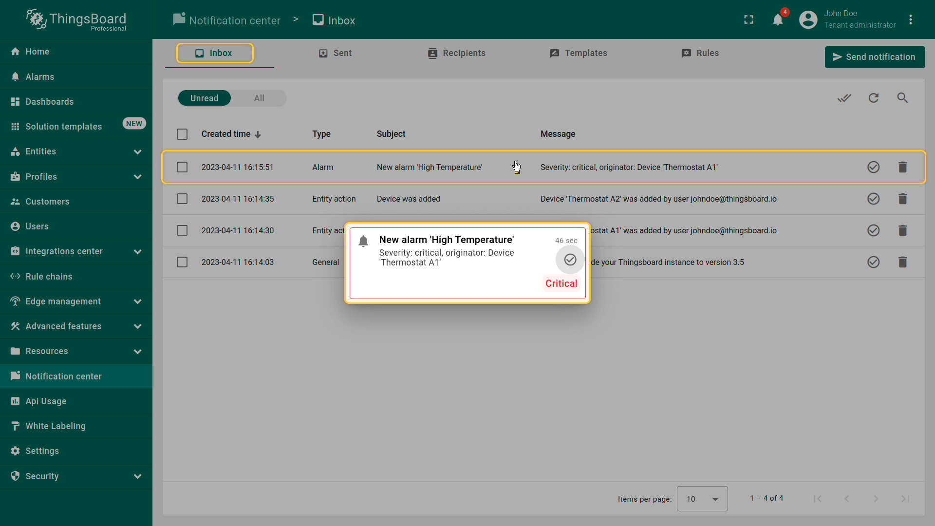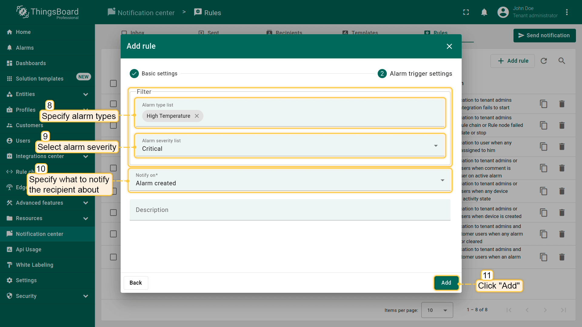 The default rule ‘Comment on active alarm’ will notify tenant administrators when comment is added by user on active alarm.