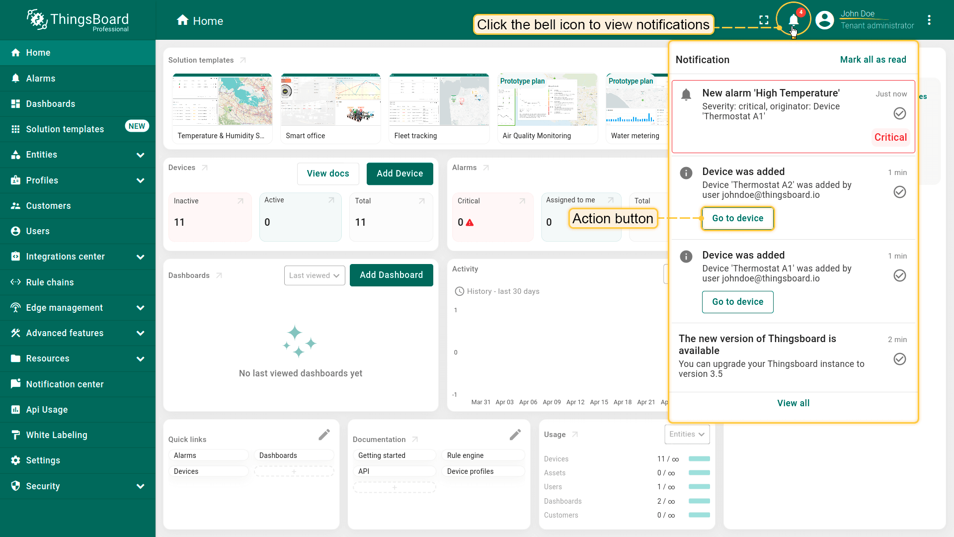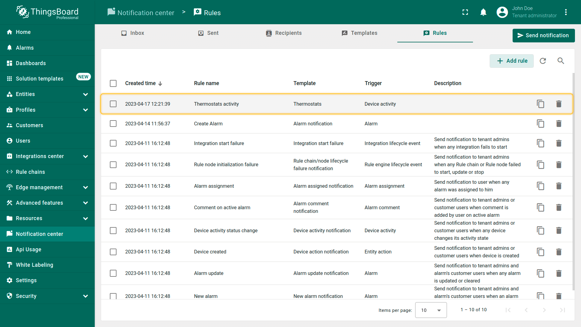 The default rule ‘Device activity status change’ will notify tenant admins when any device changes its activity state