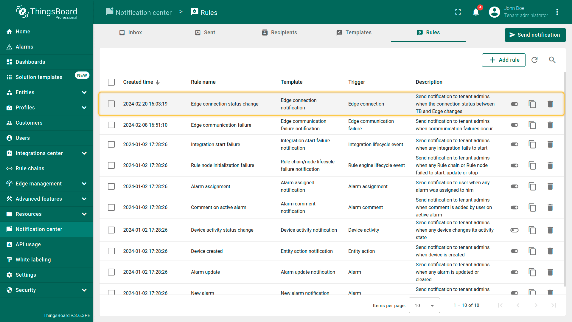 Using the “Edge connection” rule the system sends a notification to tenant admins when the connection status between TB and Edge changes.
