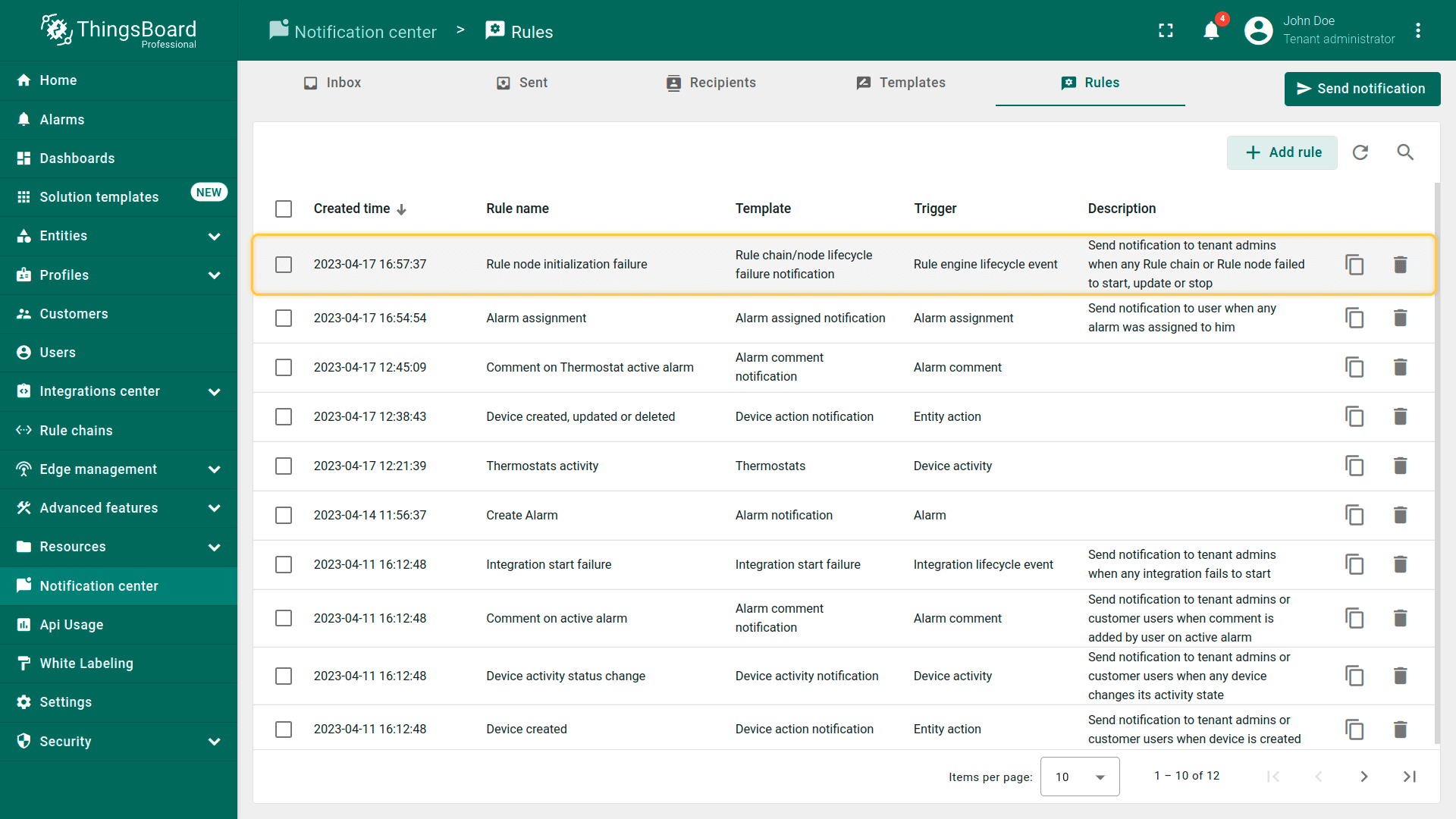 Using the “Rule engine lifecycle event” rule the system sends notifications about the rule chain or rule node lifecycle events. For example, notify when a new rule node fails to start (typically due to misconfiguration).