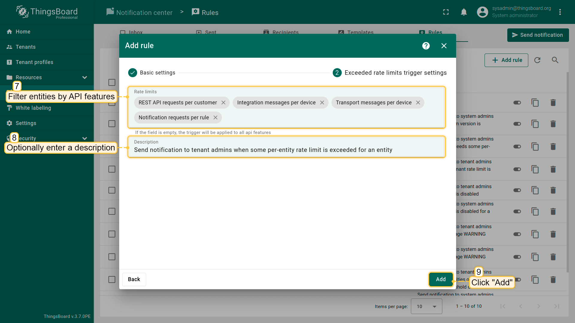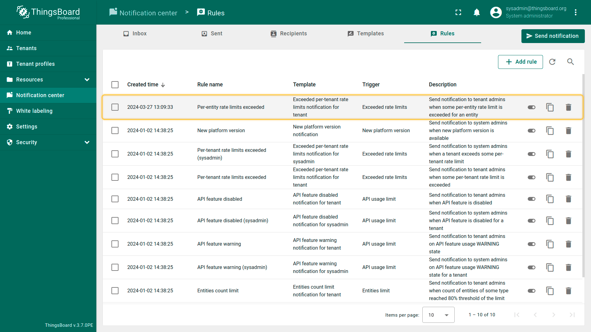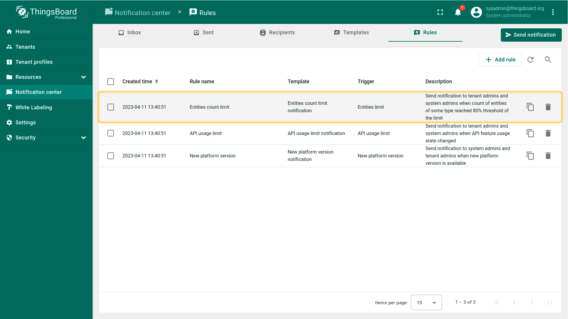 The default rule ‘Entities Limit’ will notify affected tenant administrators and system administrators when number of devices is above 80% of allowed.