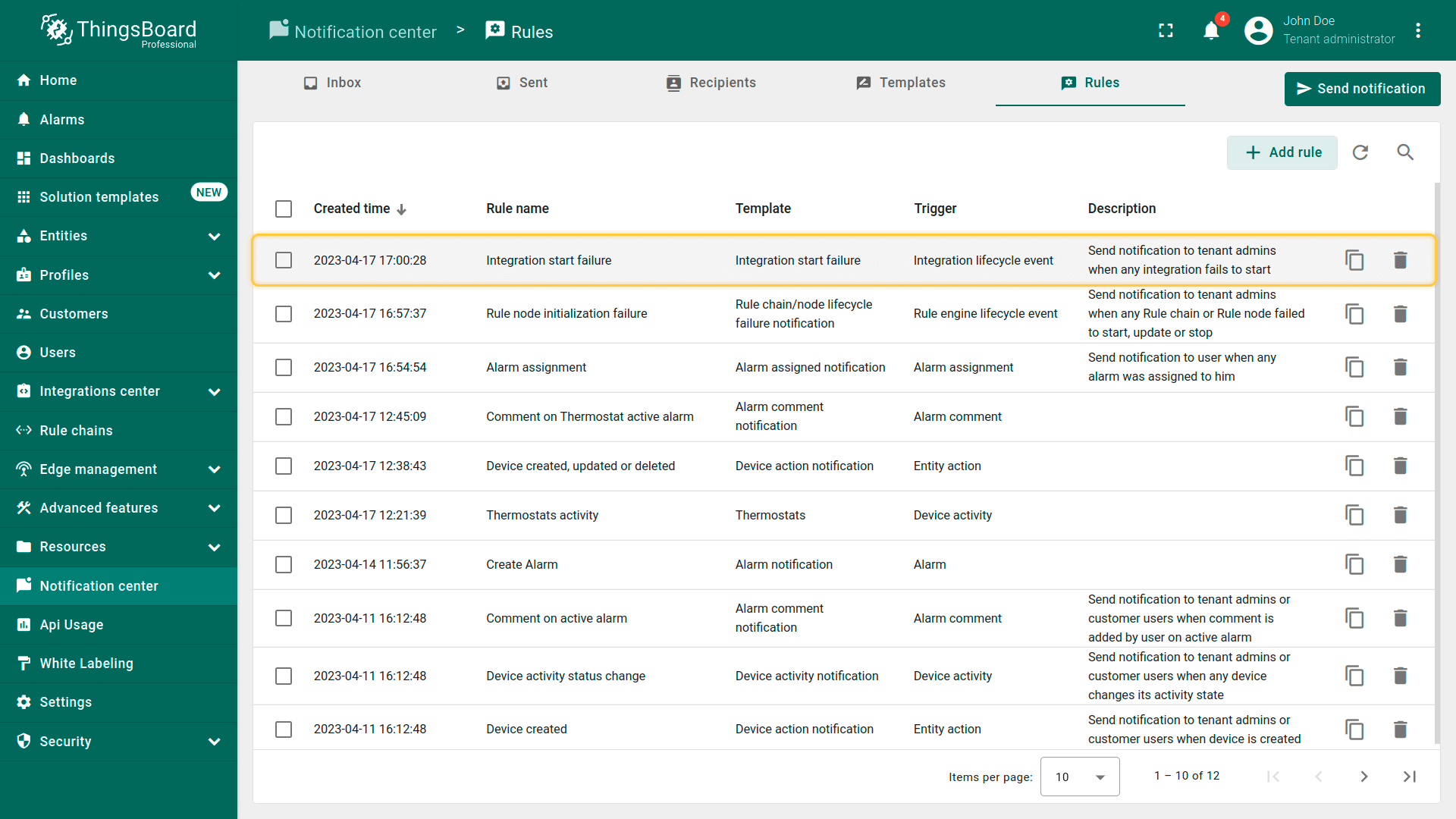 The default rule ‘Integration start failure’ will notify tenant administrators when any integration fails to start.
