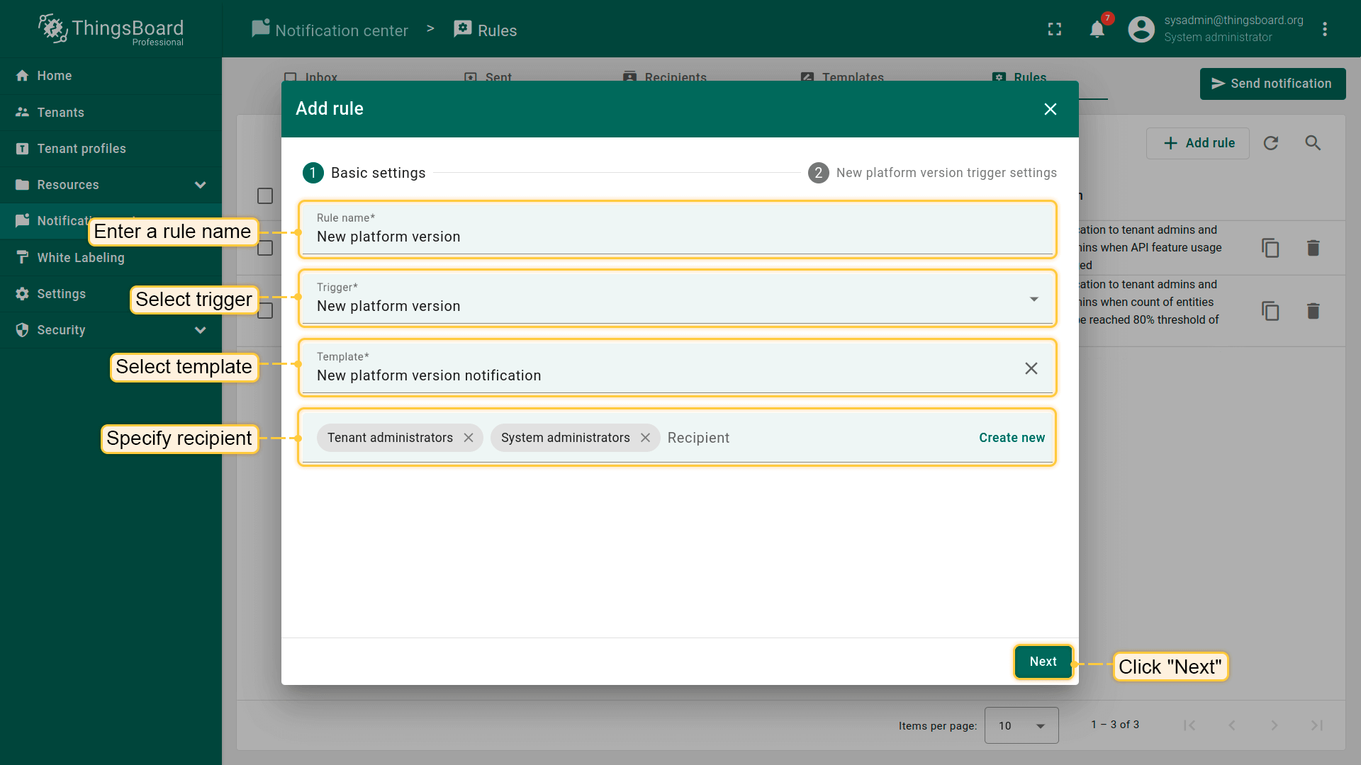 The system administrator can use the “New platform version” rule to notify tenants and system administrators about the release of a new version of the IoT Hub platform.