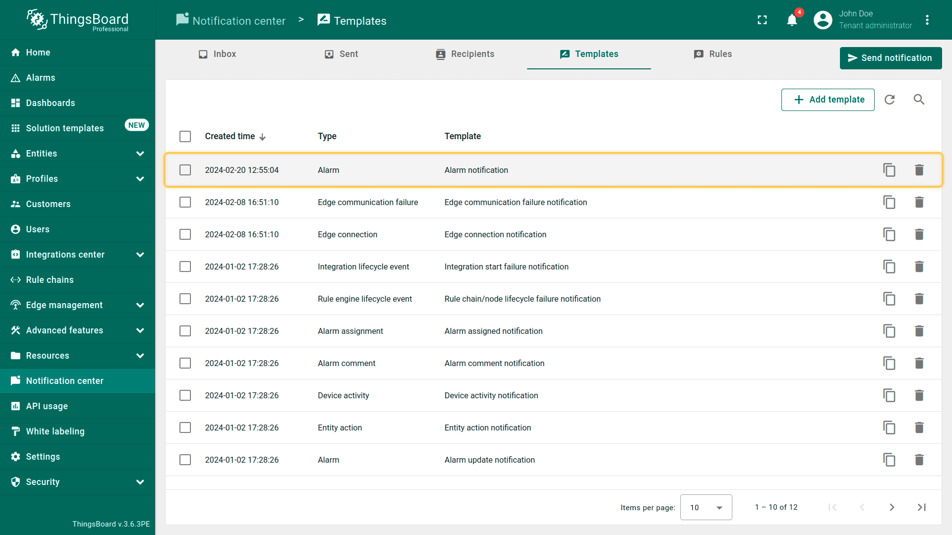The “Templates” tab displays the list of notification templates. Here you can create new templates, duplicate existing ones for easy editing, or delete those you no longer need.