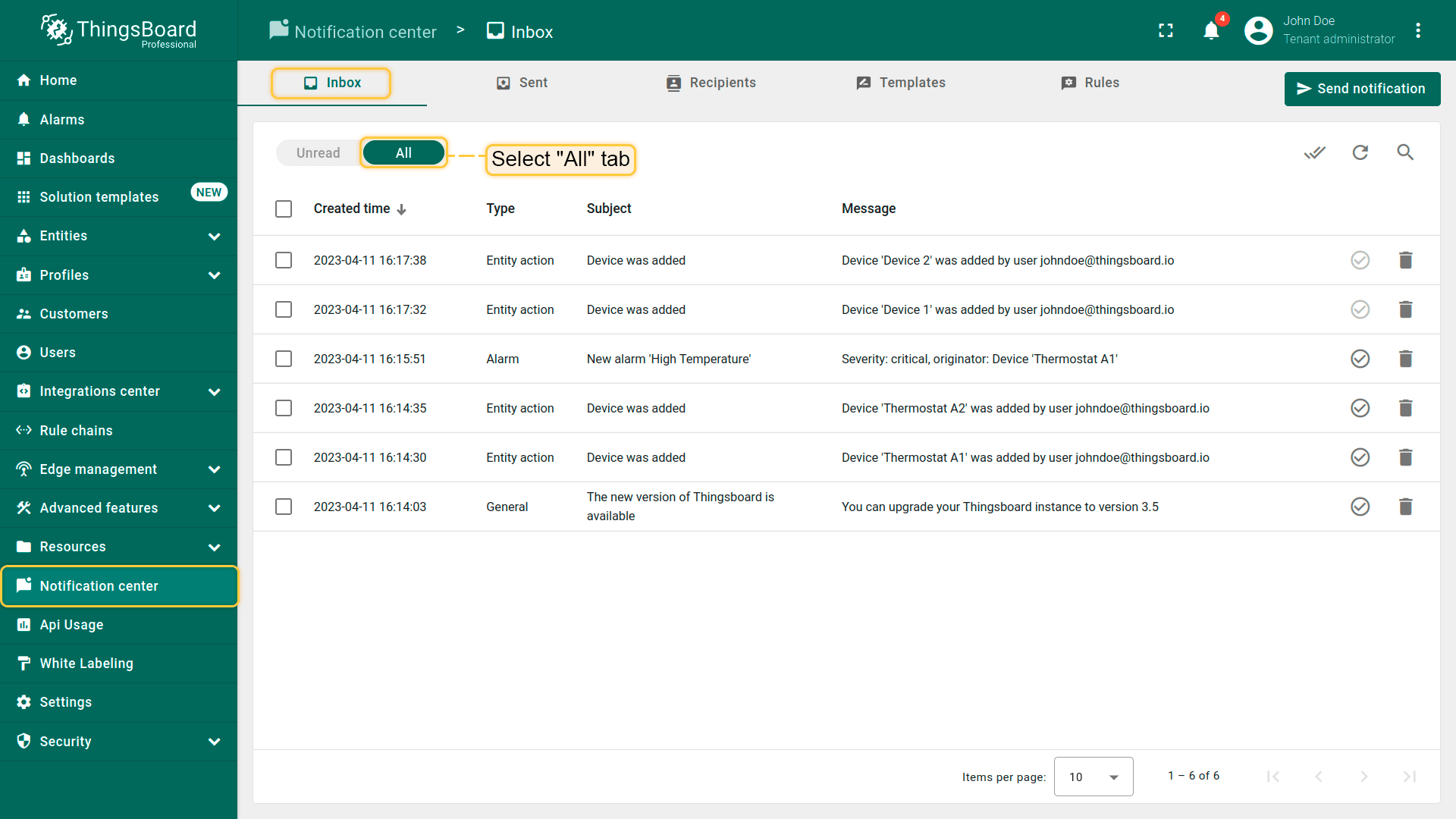 Browse your incoming notifications, mark them as read, or delete them on the “Inbox” tab. By default, only unread notifications are displayed. To view all notifications, switch to the “All” tab in the incoming notifications table.