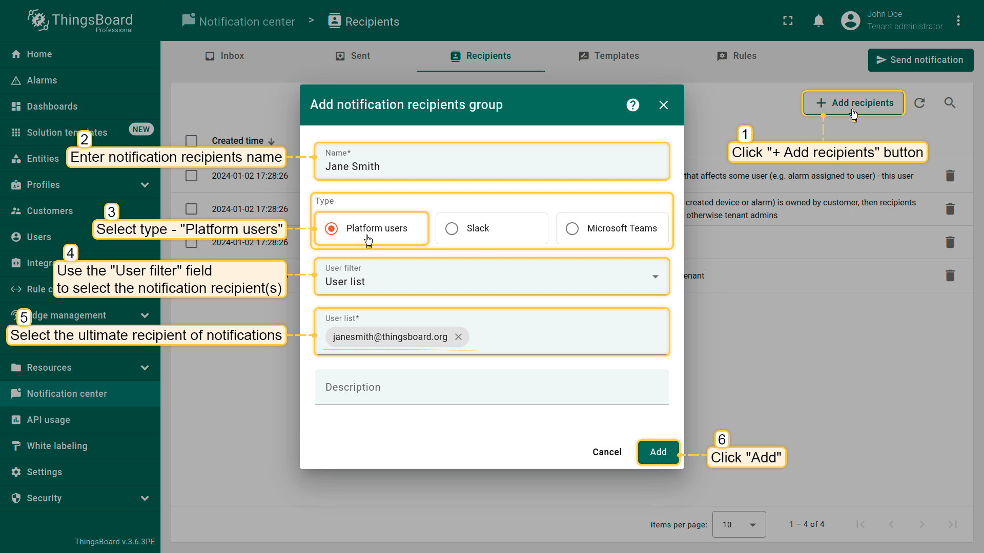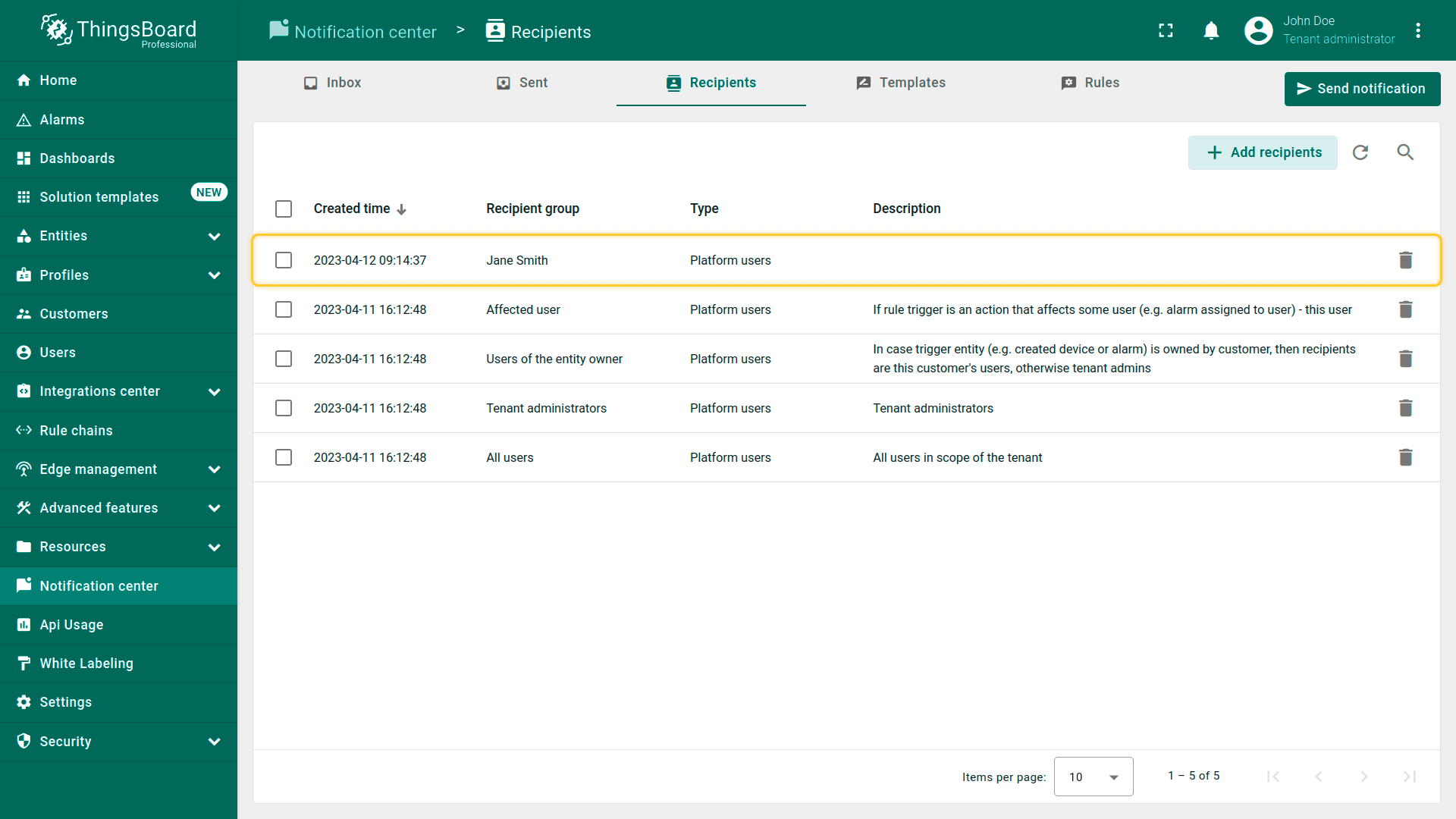 In the “Recipients” tab, you’ll find a list of configured notification recipients. You can add, edit existing, and delete notification recipients as needed. Recipients can be added based on their roles, individual user accounts, predefined groups, etc.