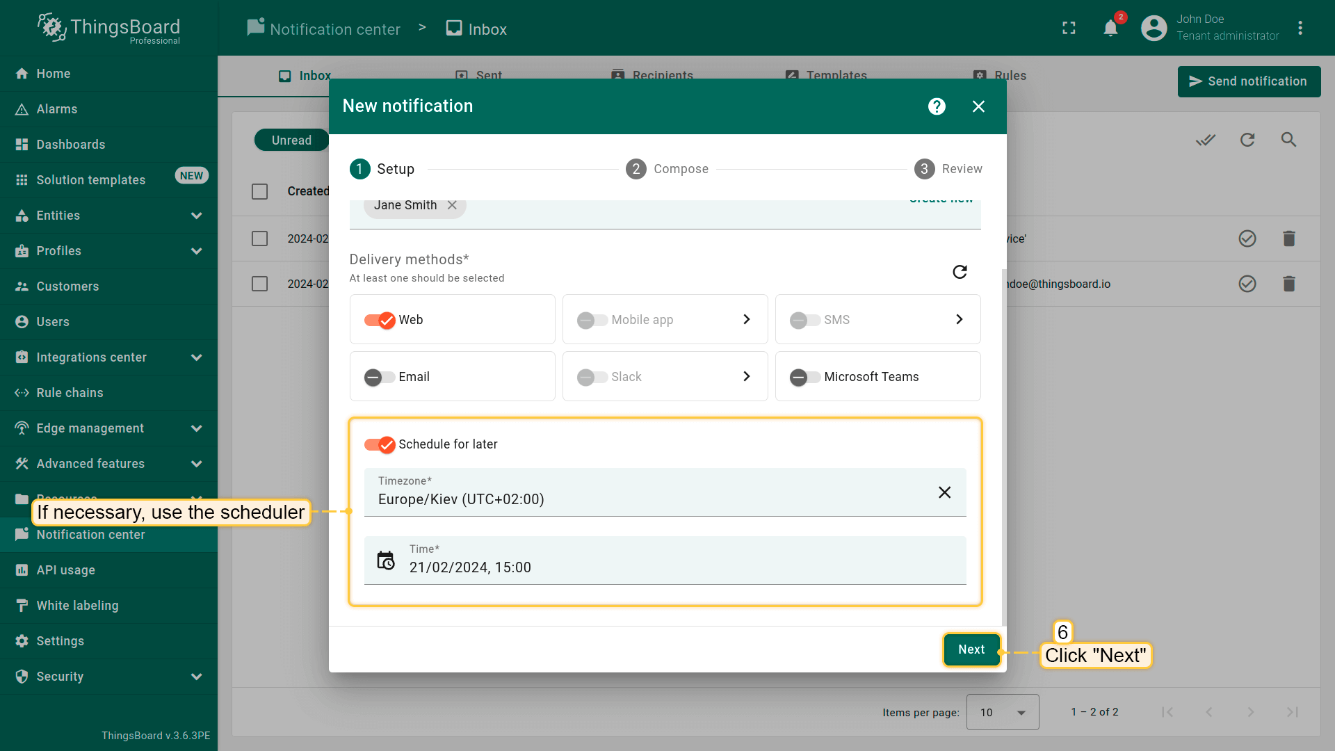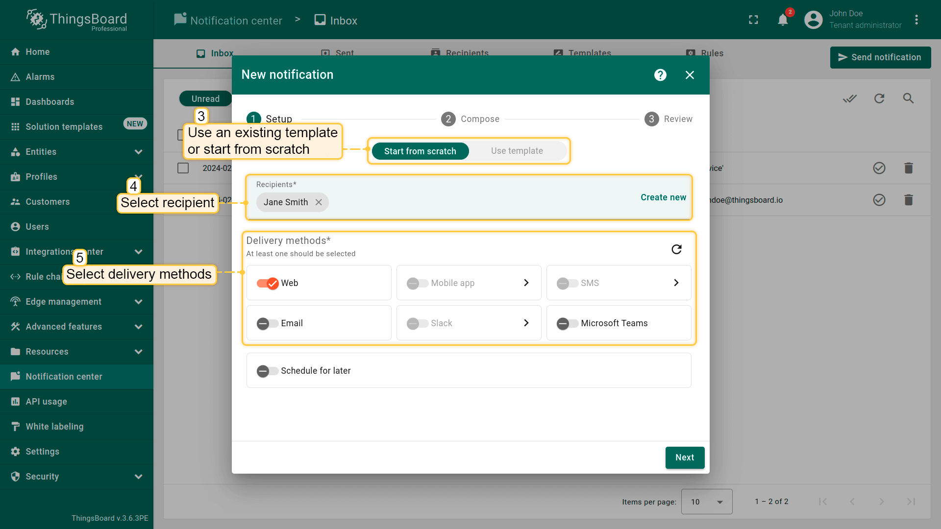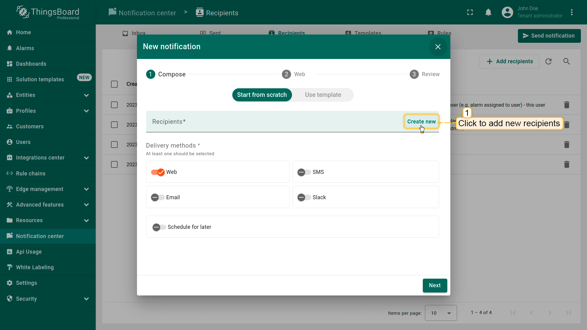 - Select recipients and one or more delivery methods. In this example, let's consider the Web delivery method;