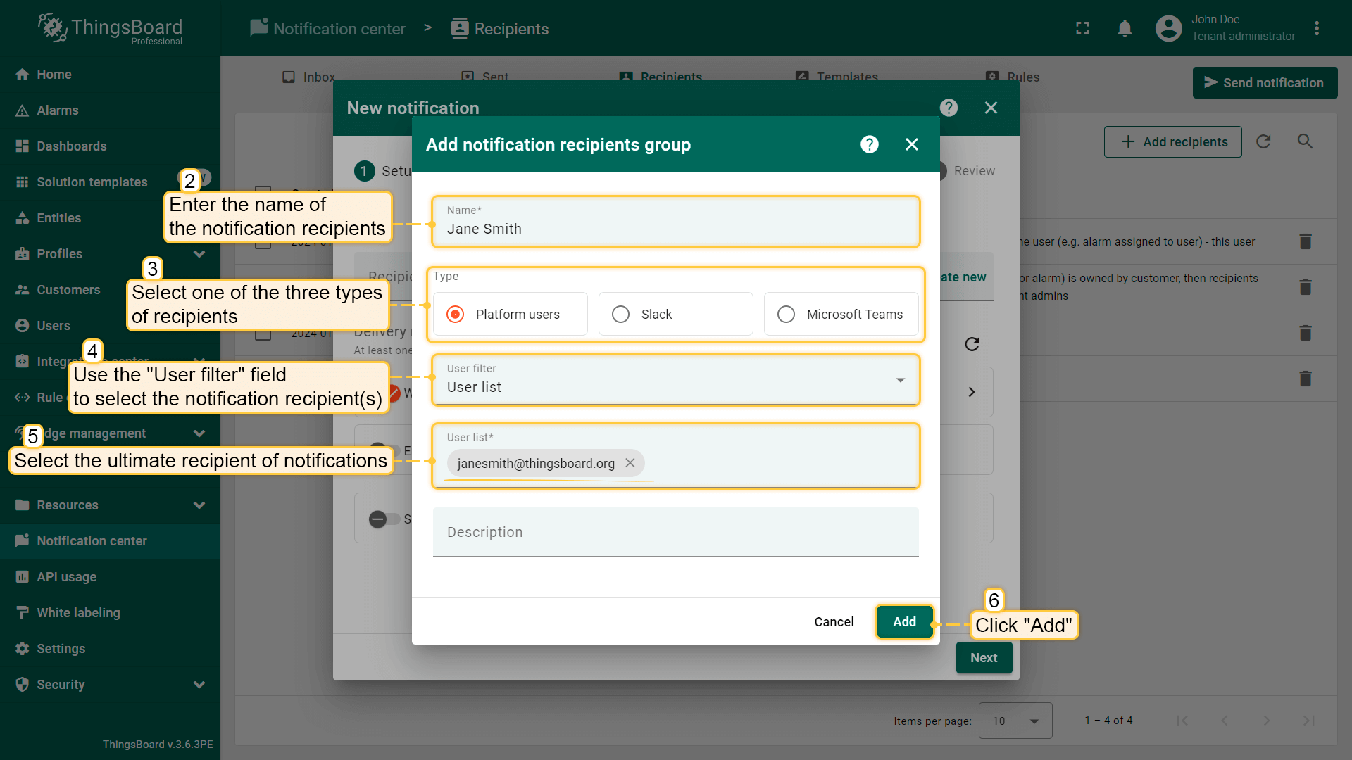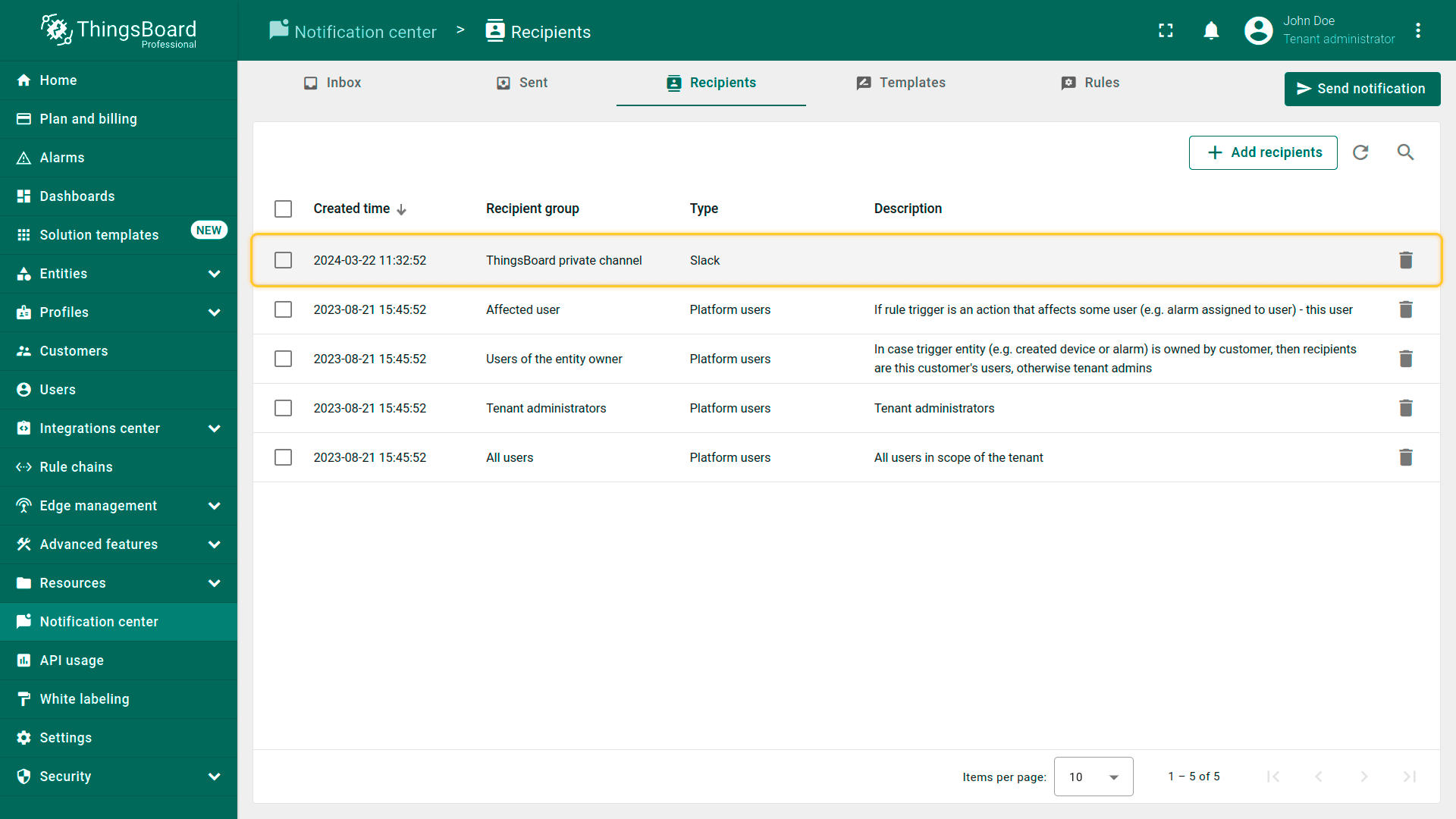 A new recipient has been added. Now you can use it to send a new notification or create a new notification rule.