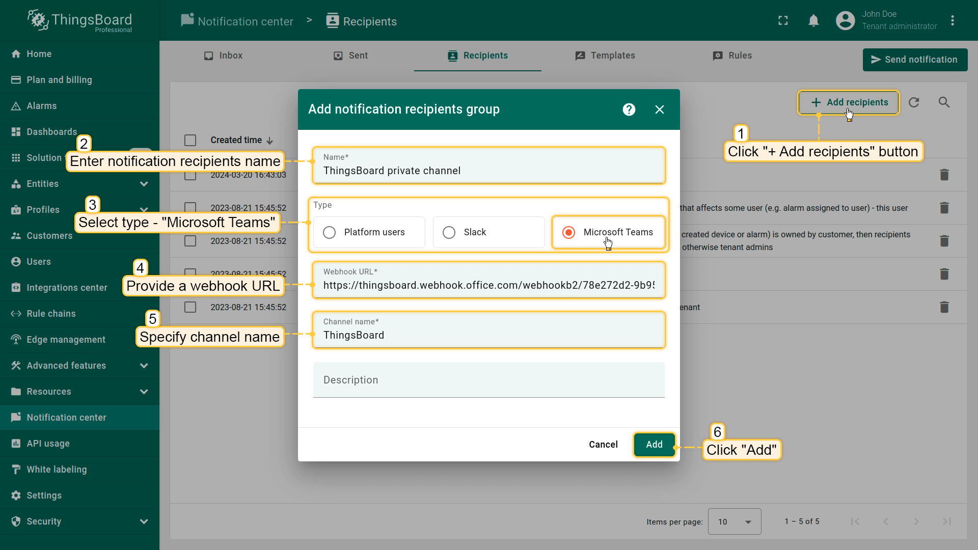 Microsoft Teams. Integration of Microsoft Teams with IoT Hub allows for delivering notifications in the form of messages to specific channels in your Microsoft Teams environment. To use this method a tenant administrator must get webhook URL for a needed Microsoft Teams channel using this guide.