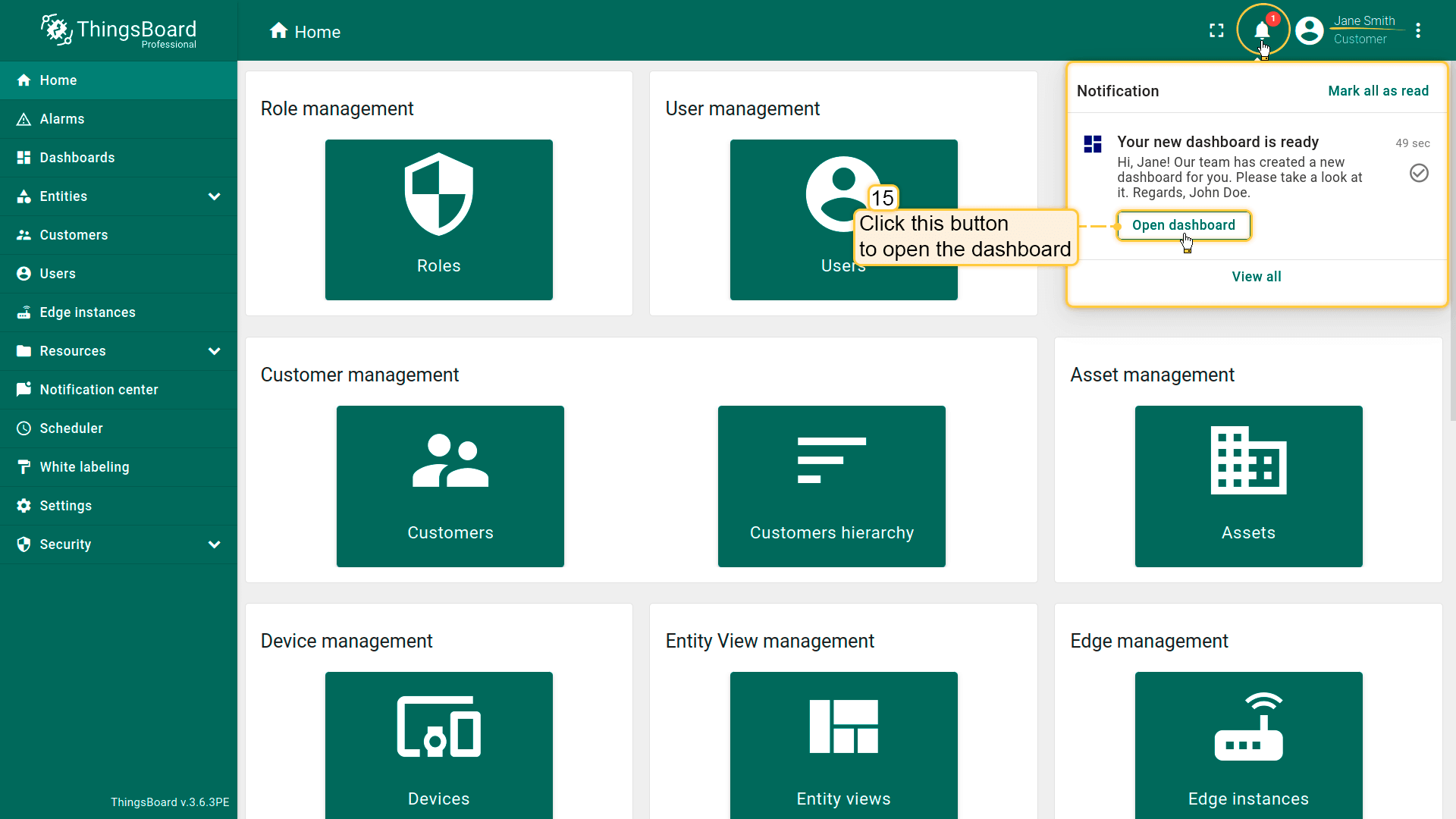 - By clicking on the "Open this dashboard" button in the message, the user will open the dashboard window.