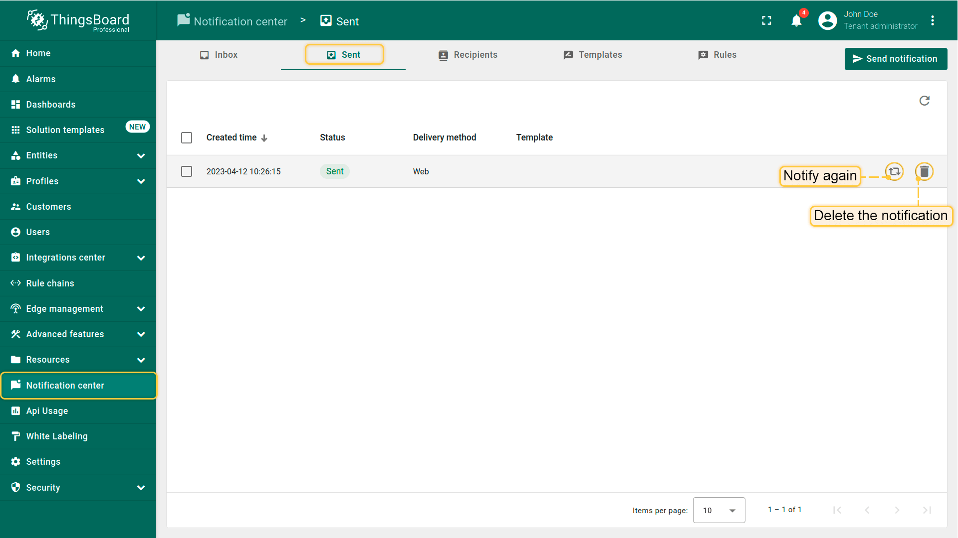 The Notification center is accessible through the sidebar menu and includes options for sending notifications, viewing inbox and sent messages, managing recipients, creating templates, and setting up rules for automated notifications.