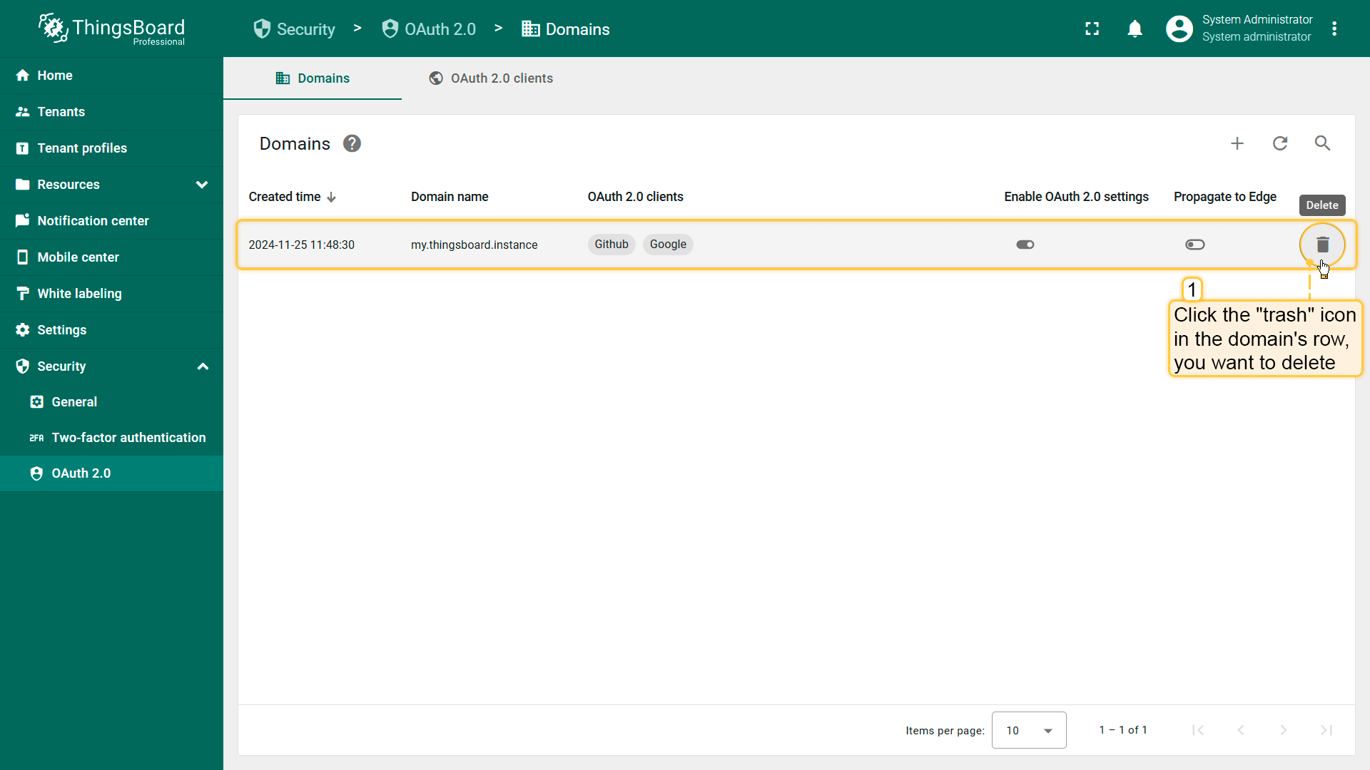 - Click the “trash” icon in the domain’s row you wish to remove;