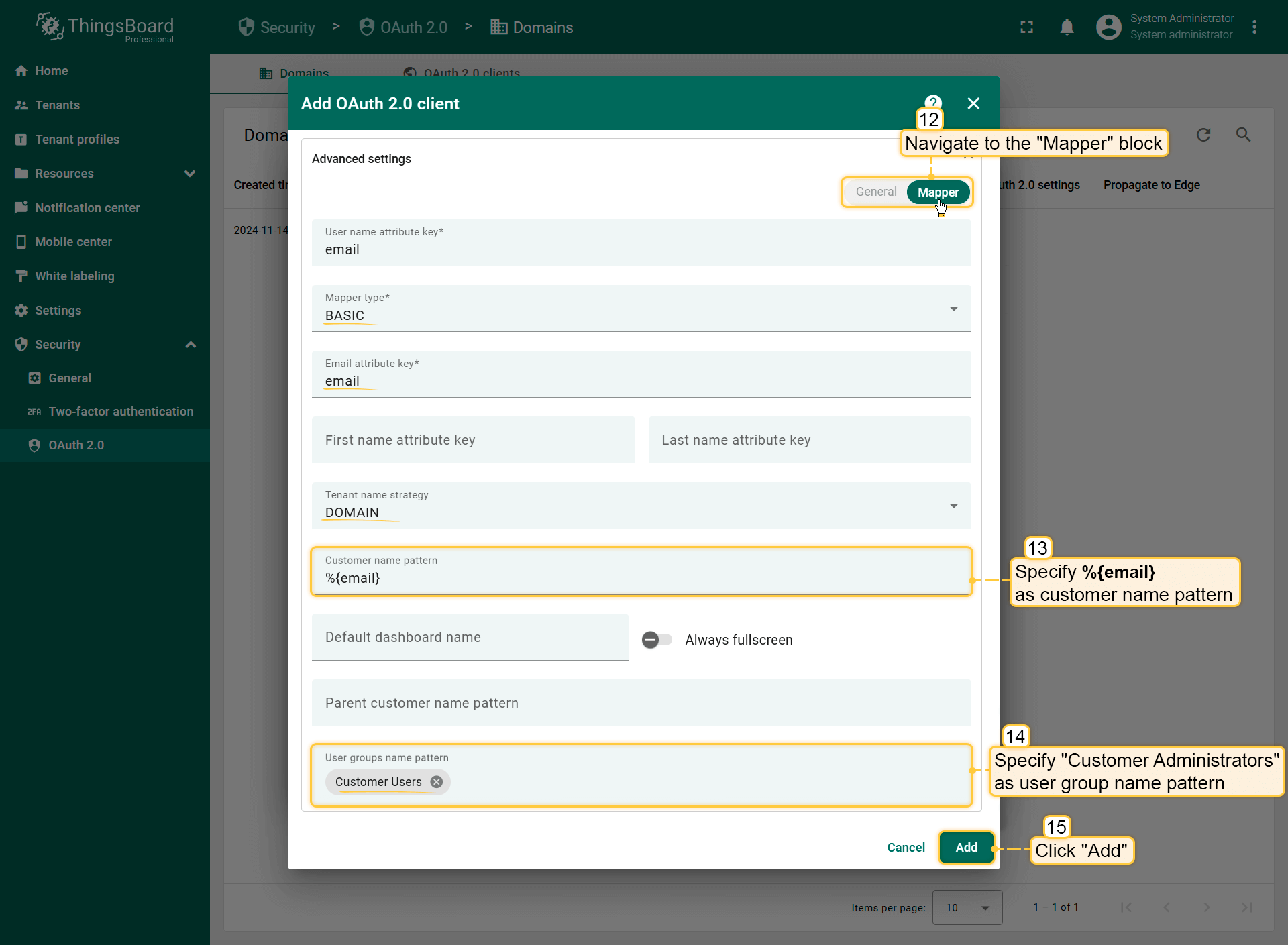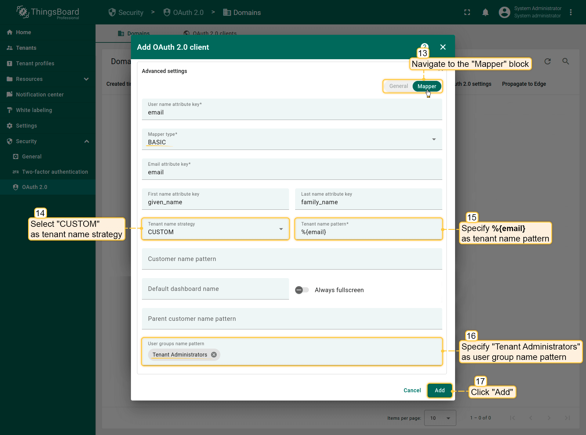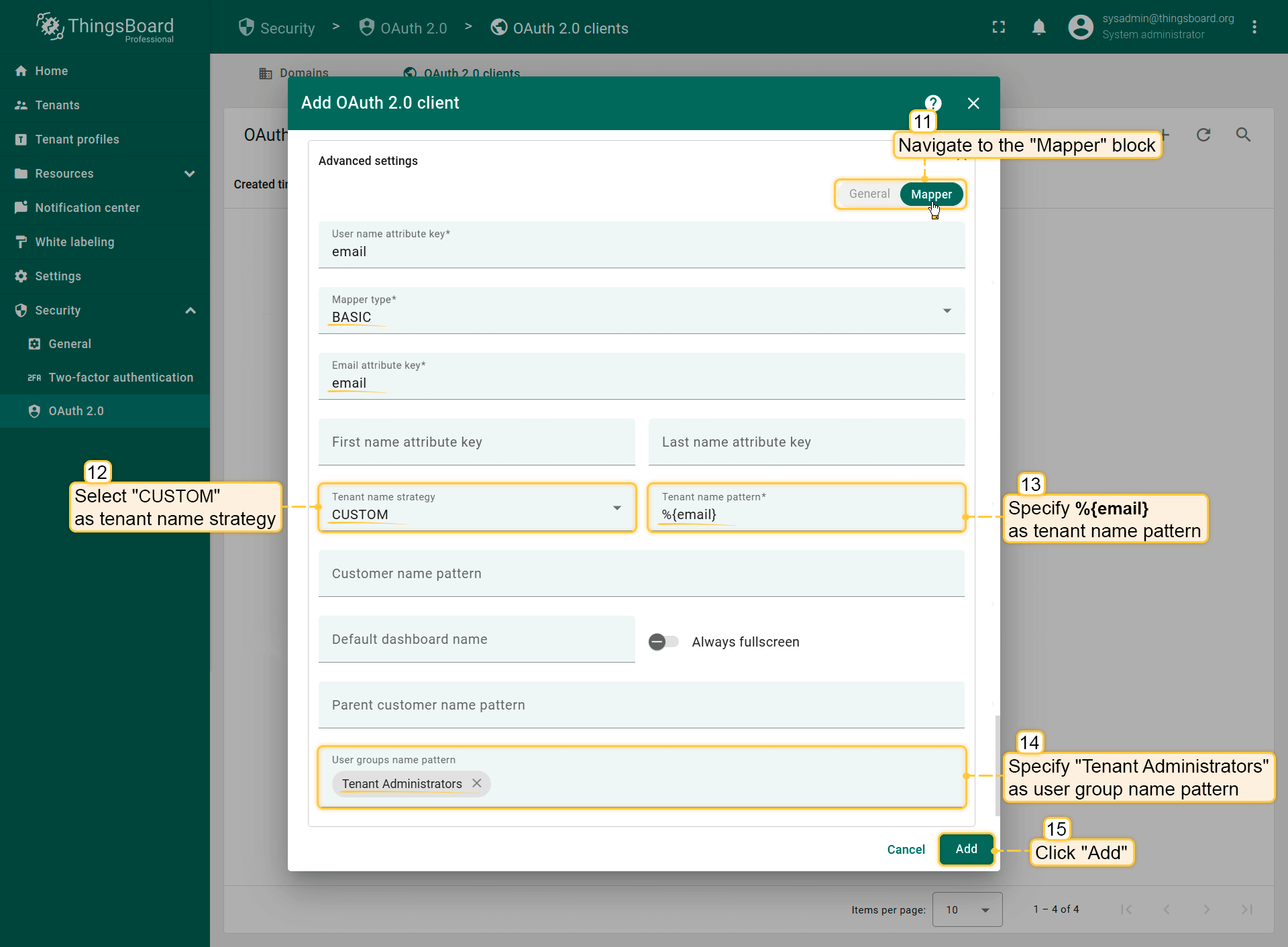 - Click “Add” to confirm adding the OAuth 2 client.
