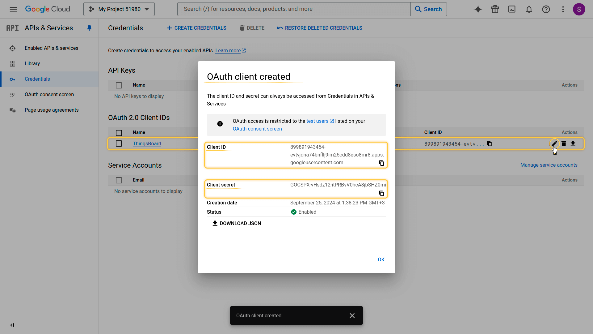 OAuth client created. You now have credentials consisting of a Client ID and a Client secret.