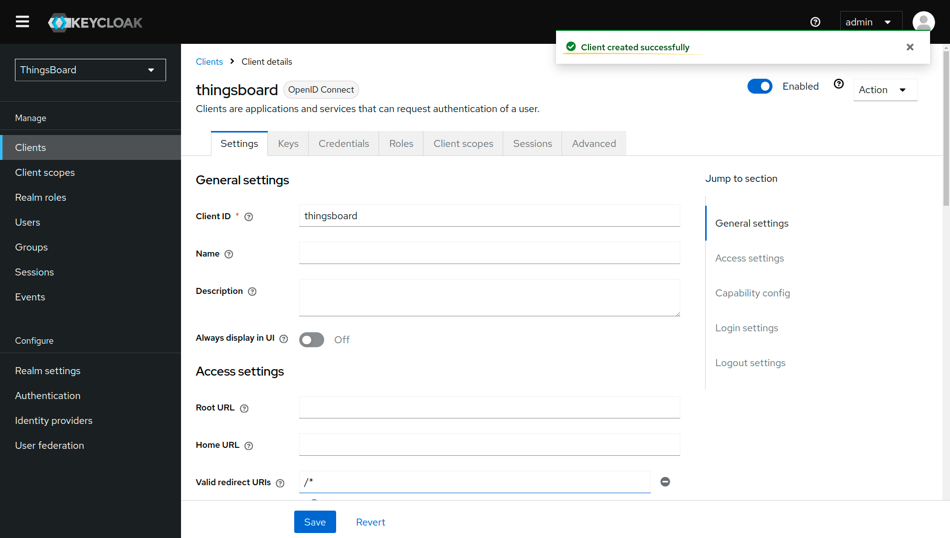 - Enter “thingsboard” as the client ID. Leave the client type as “OpenID Connect”. Click “Next”;