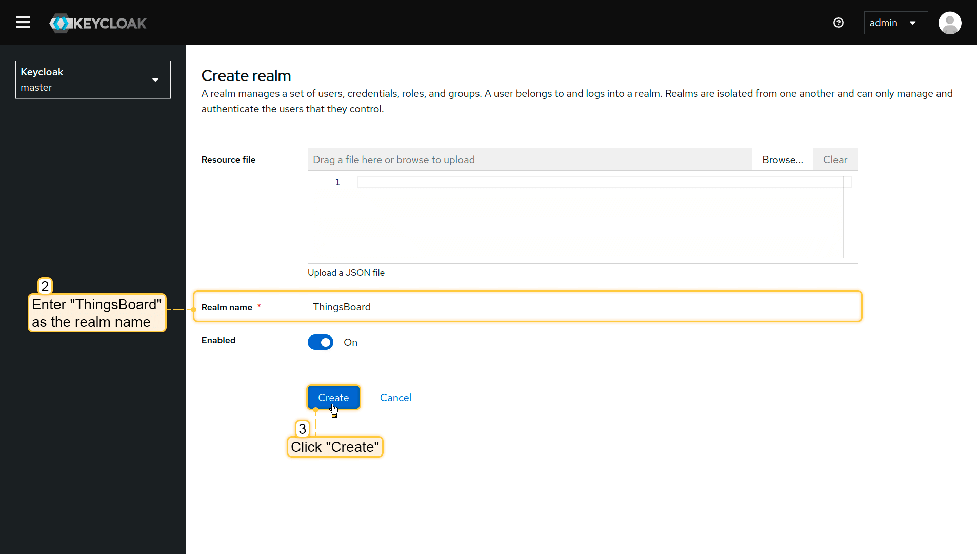 - Click “Keycloak” next to the master realm, then click “Create realm” button;