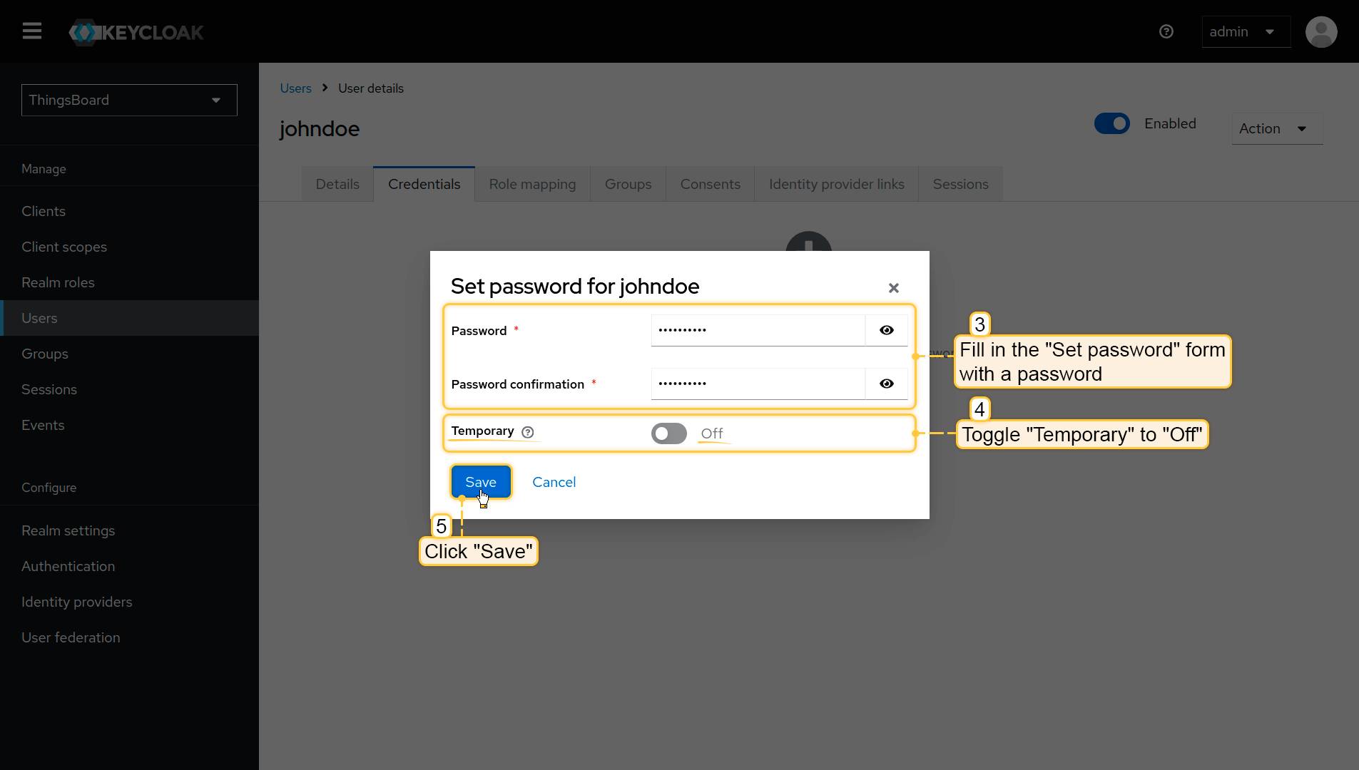 - Fill in the “Set password” form with a password. Toggle “Temporary” to “Off” so that the user does not need to update this password at the first login.