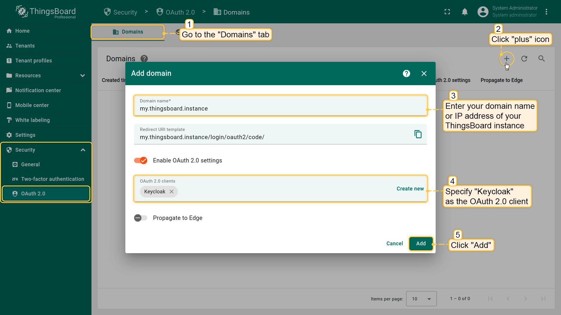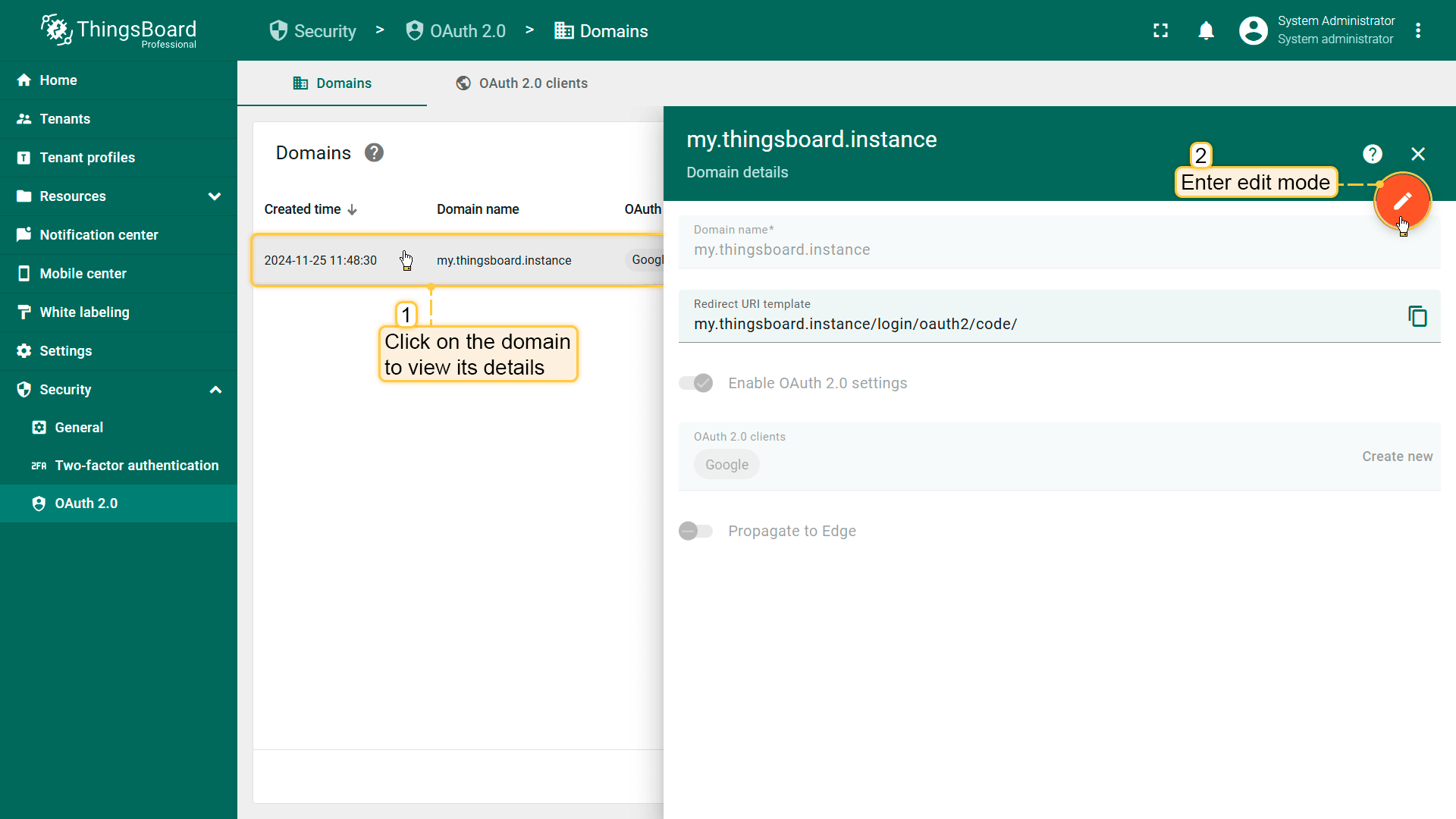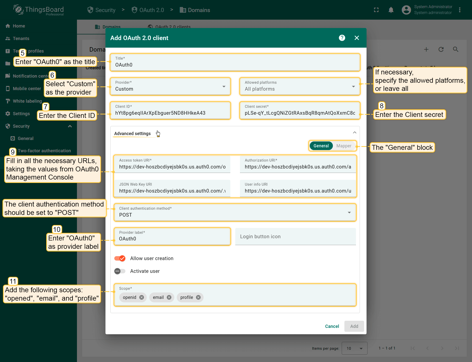- Provide your domain name and OAuth 2.0 client;