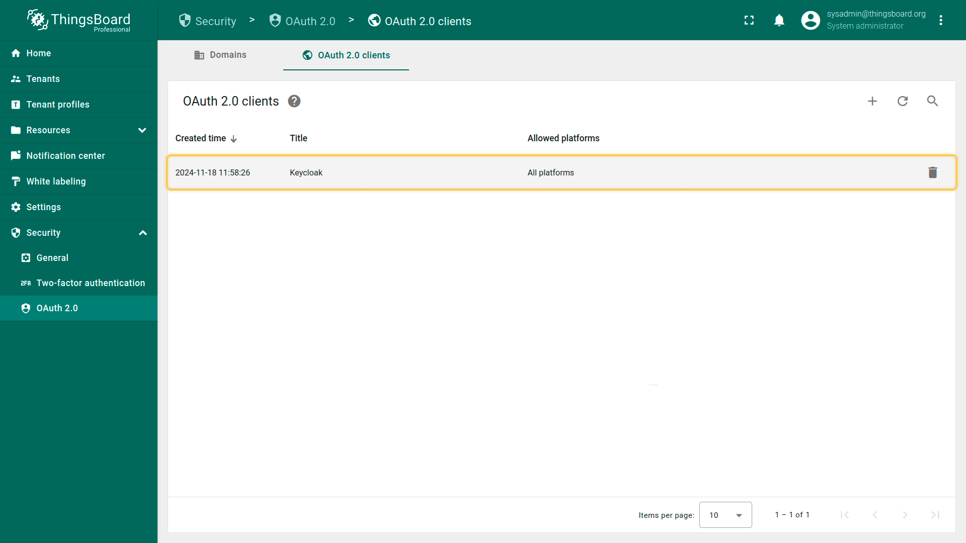 - On the “Domains” tab of the “OAuth 2.0 client” page, click the “plus” icon to add new domain;