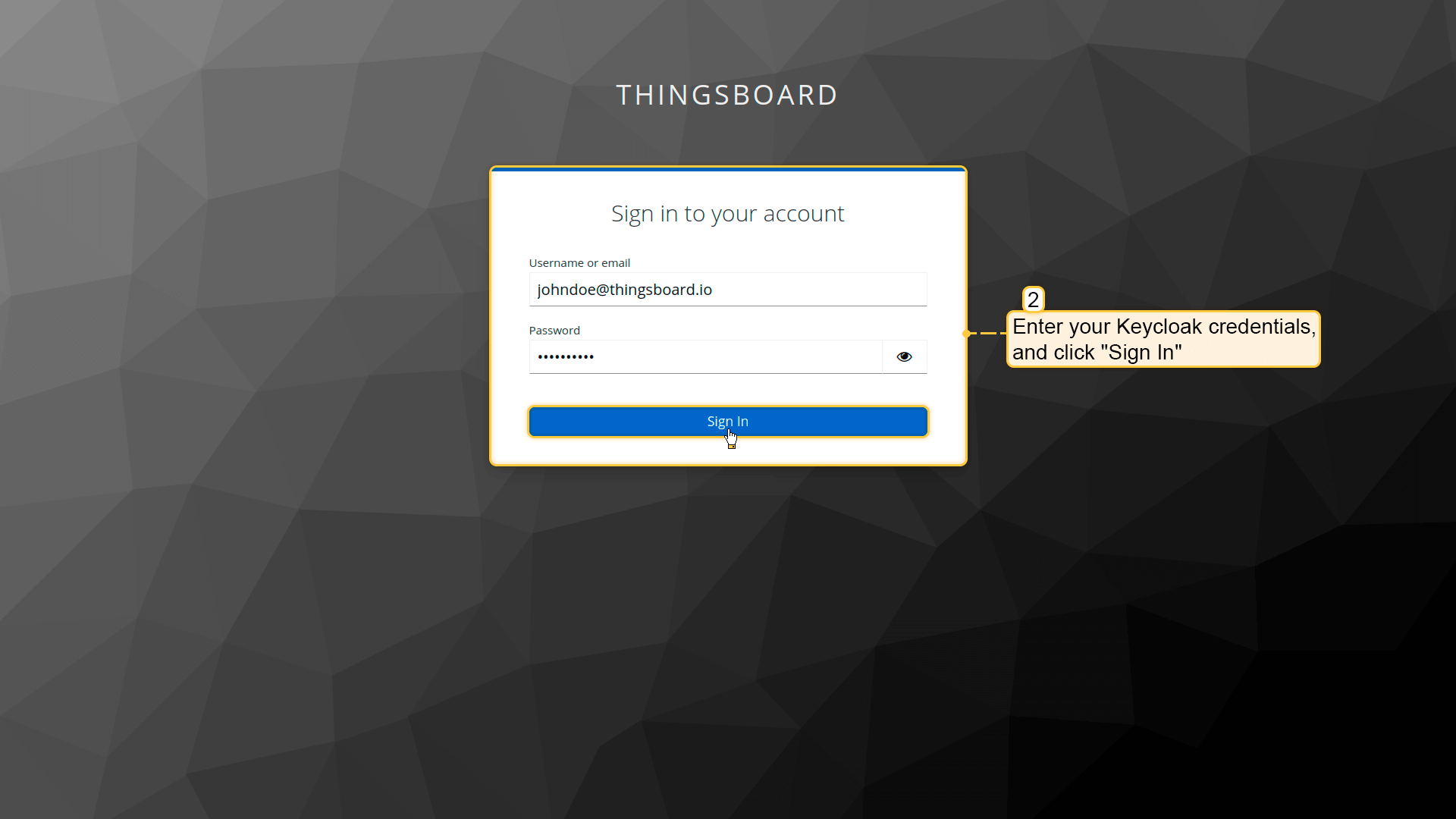 Go to the IoT Hub login screen. You will see an additional option, “Login with Keycloak”. Click this button. A window will open prompting you to sign in to your Keycloak account. Enter your Keycloak credentials, and click “Sign In”. You are now logged into IoT Hub using Keycloak authorization credentials.