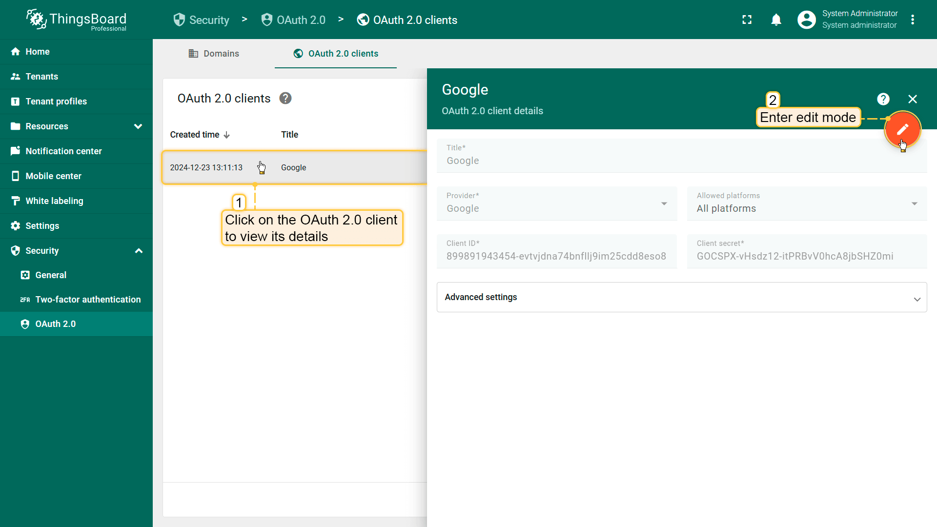 Editing OAuth 2.0 client