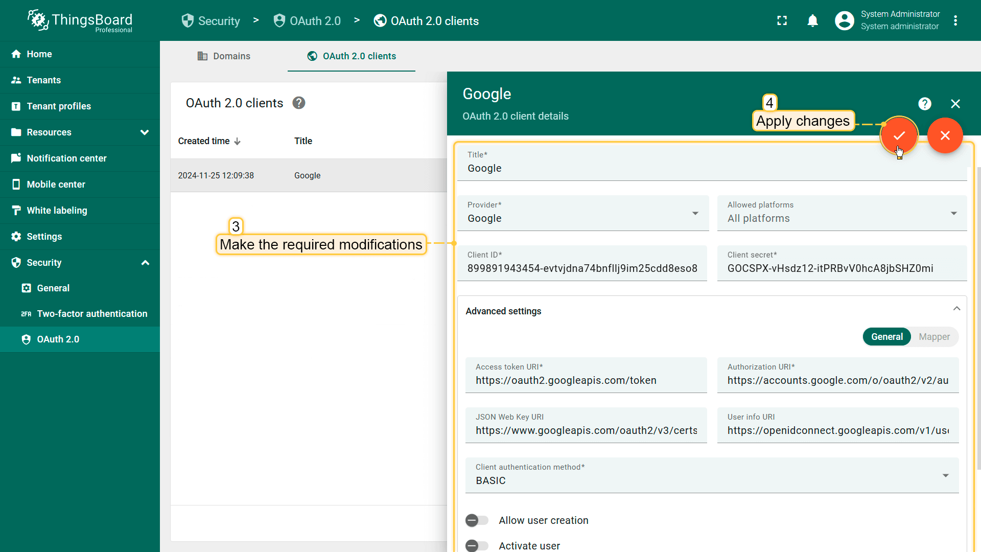 To update the settings for an existing OAuth 2.0 client, follow these steps: