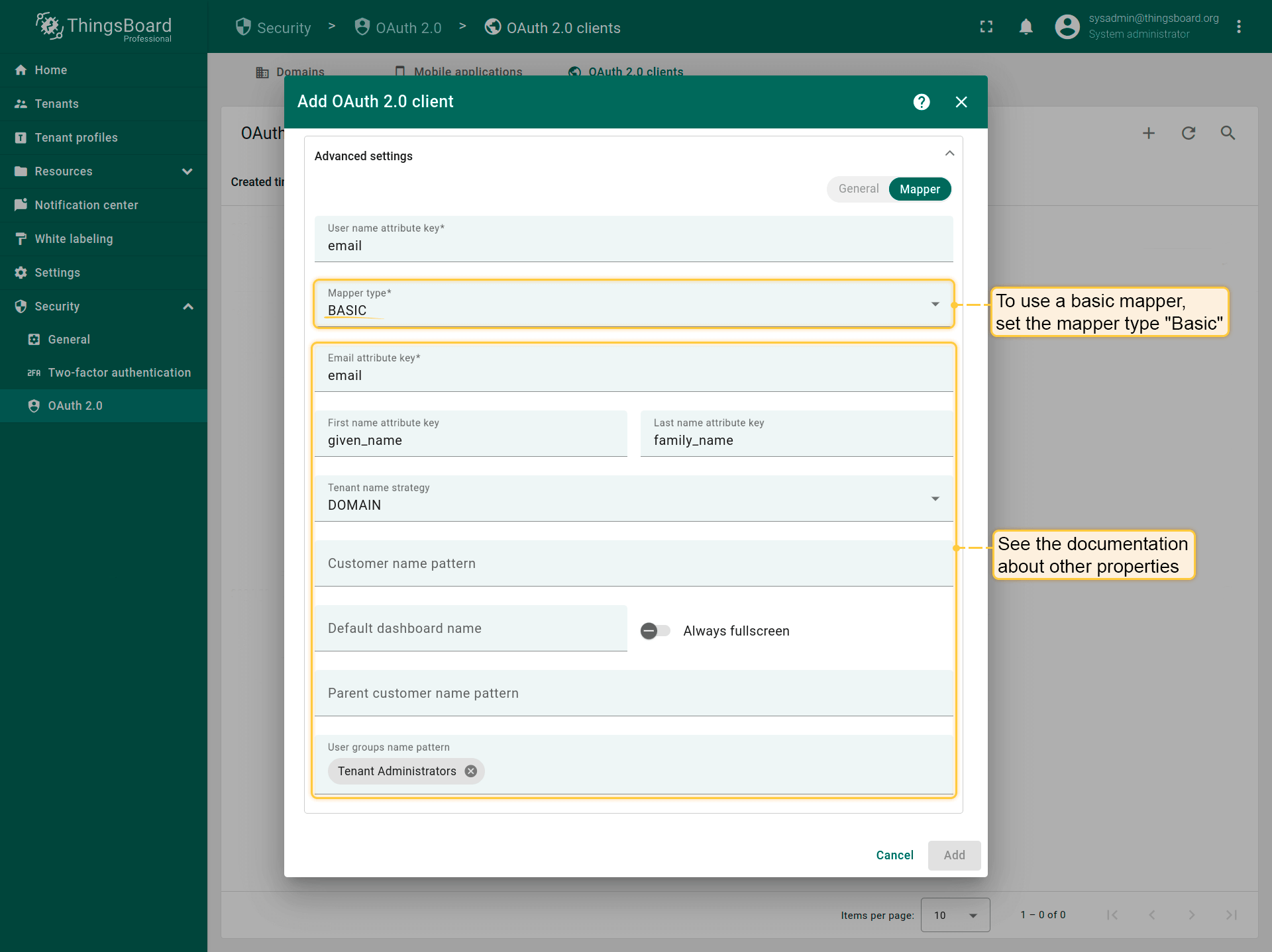 Specify %{email} as tenant name pattern (more details about these properties are described below in the “Basic mapper” part);