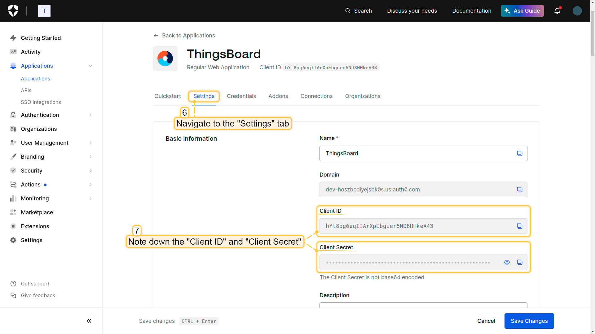 You now have credentials consisting of a Client ID and a Client secret. You can find the Client ID on the “Settings” tab. The Client Secret is located on the “Credentials” tab.