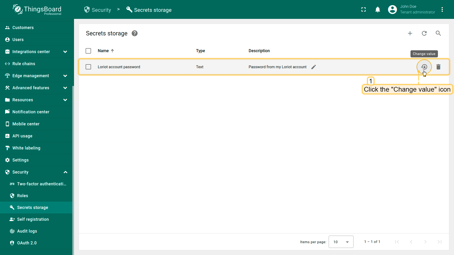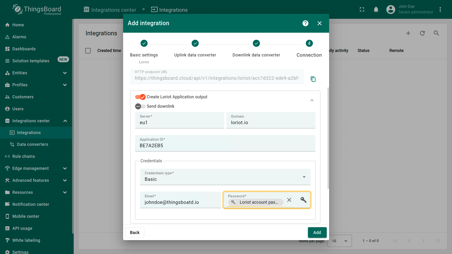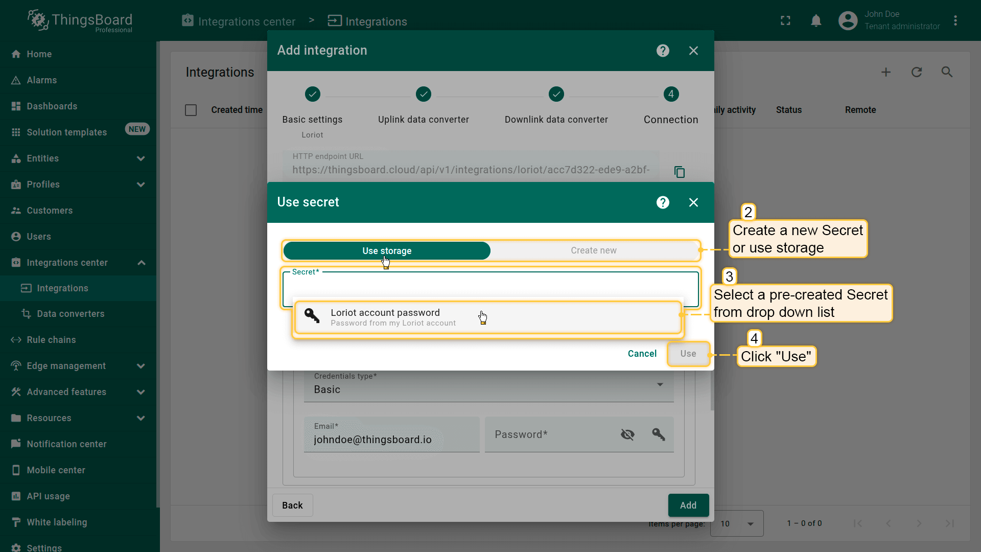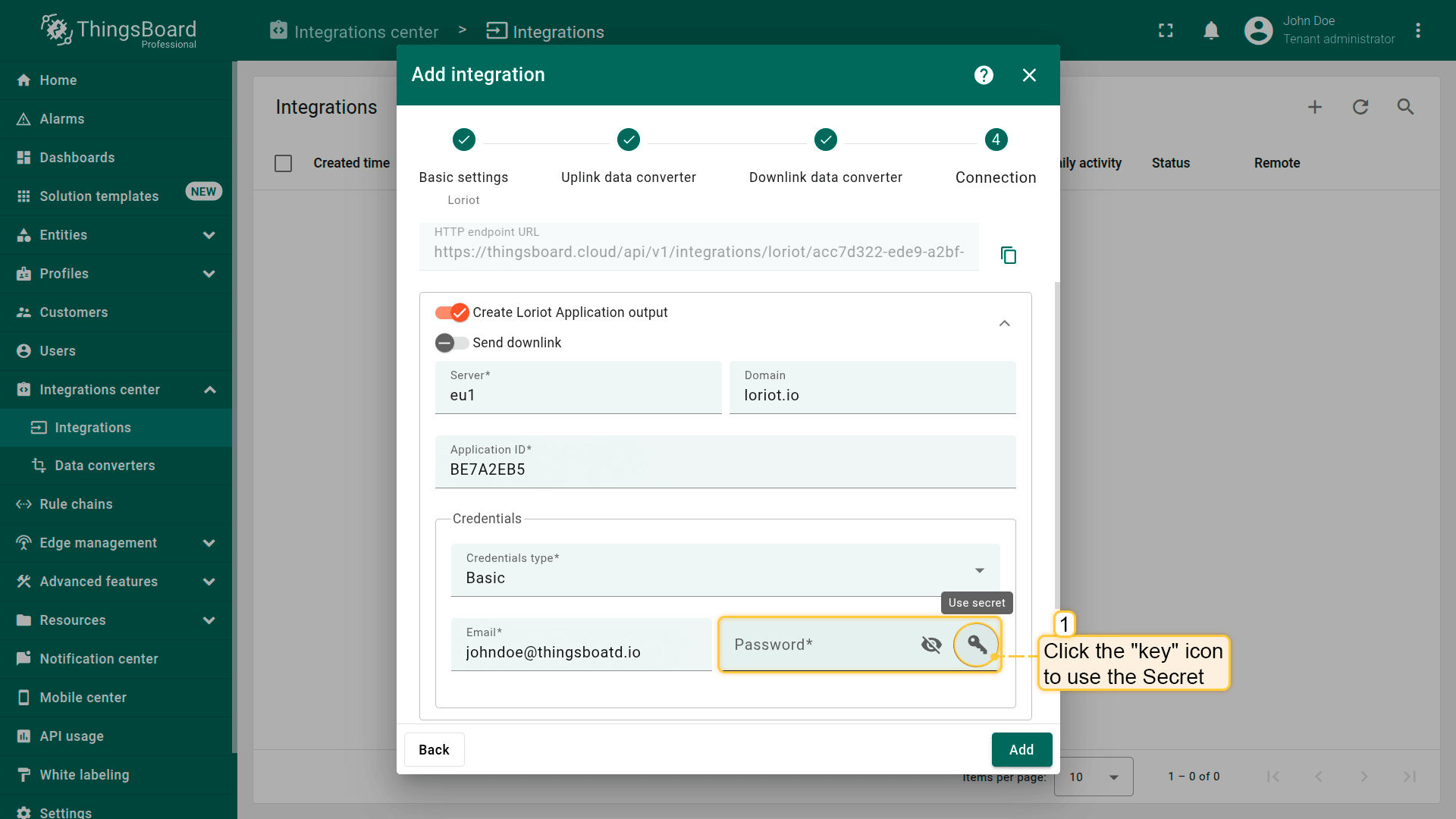 Let's look at an example of using a Secret in a Loriot integration. Instead of manually entering your Loriot account password, we'll use a pre-created Secret for secure access.