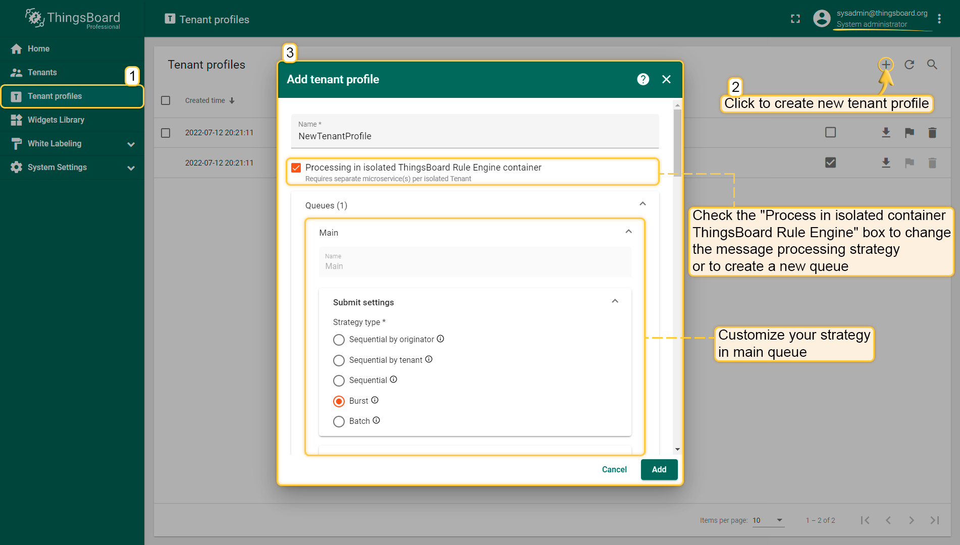 - Step 1. Open tenant profile menu and add new tenant profile. Click "isolated IoT Hub RuleEngine" box, Main queue added by default and can not be renamed or deleted.