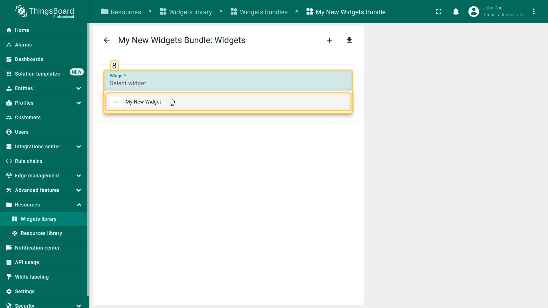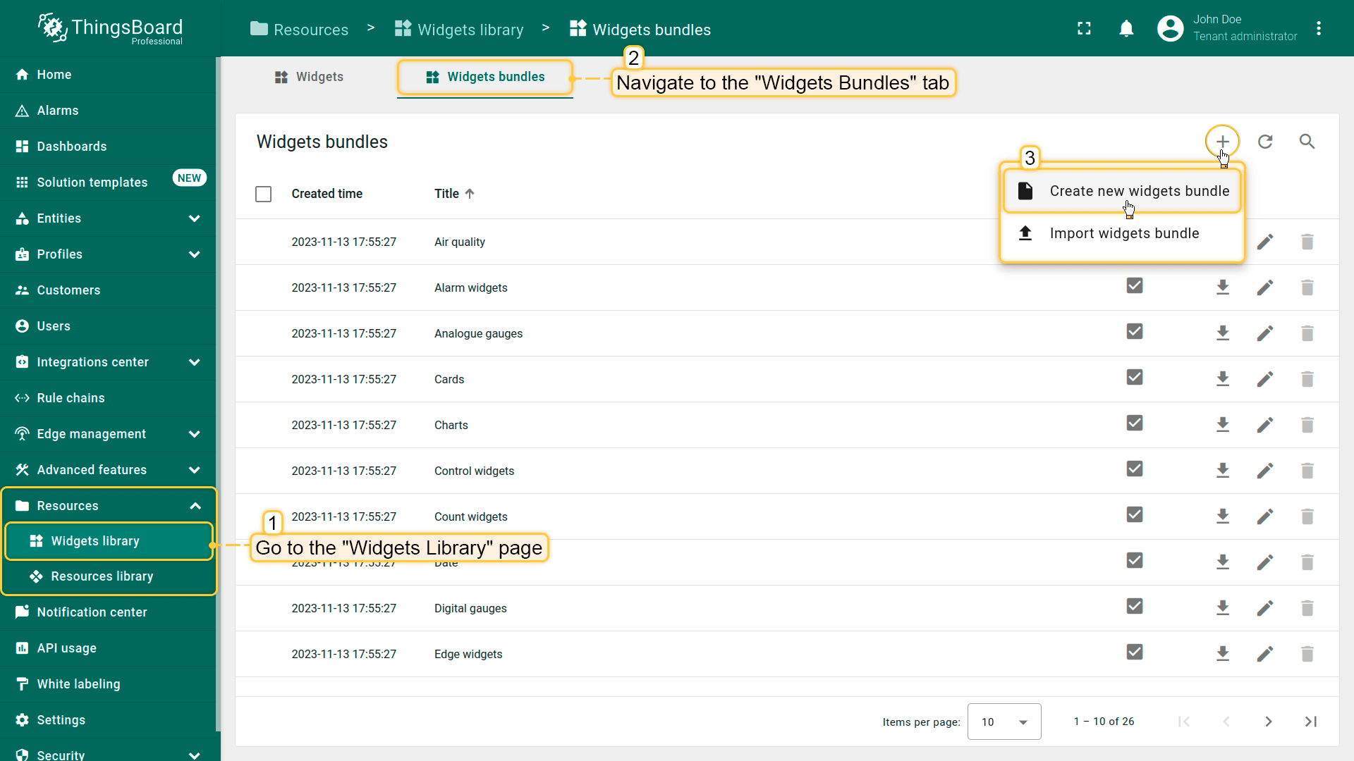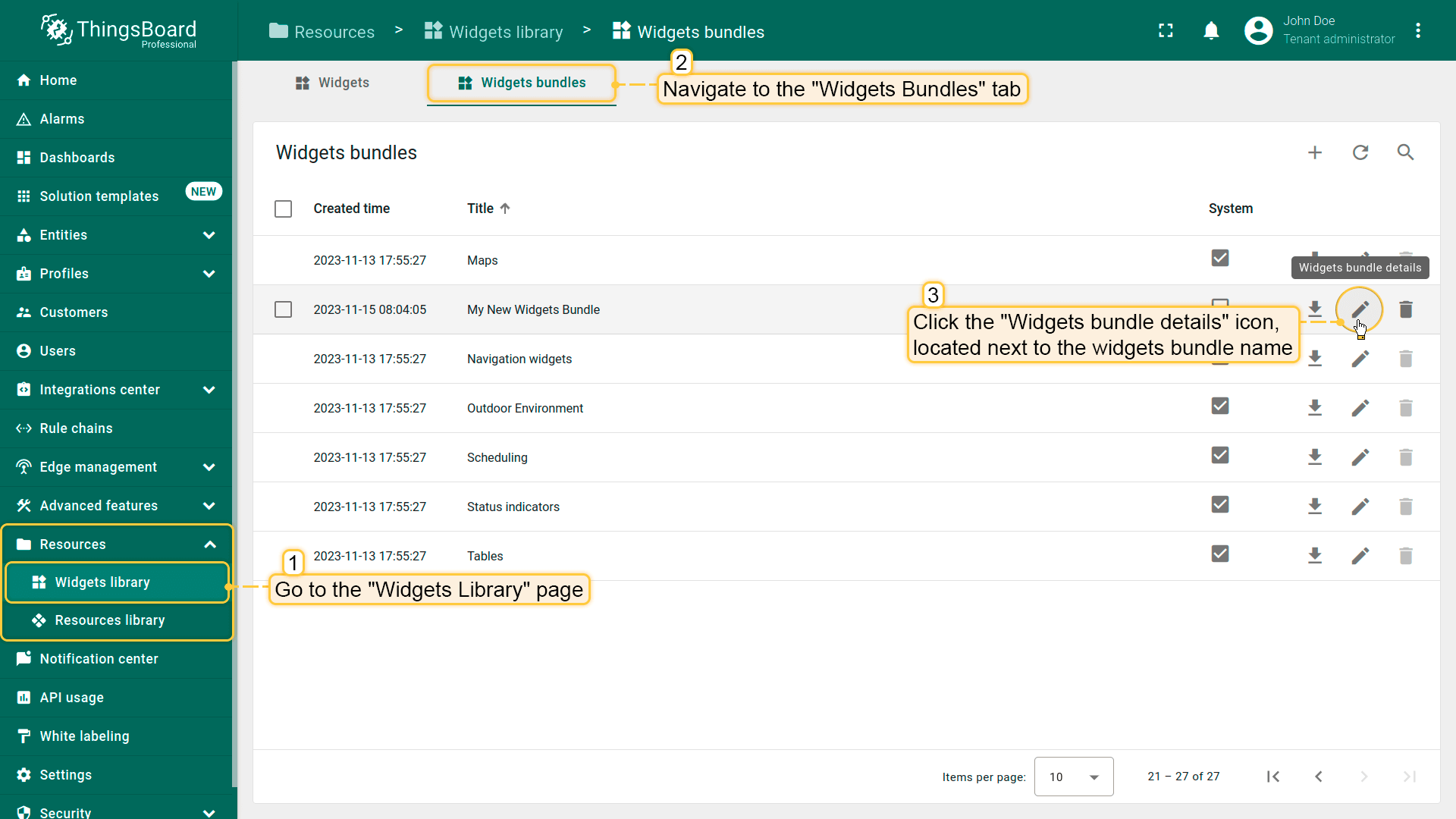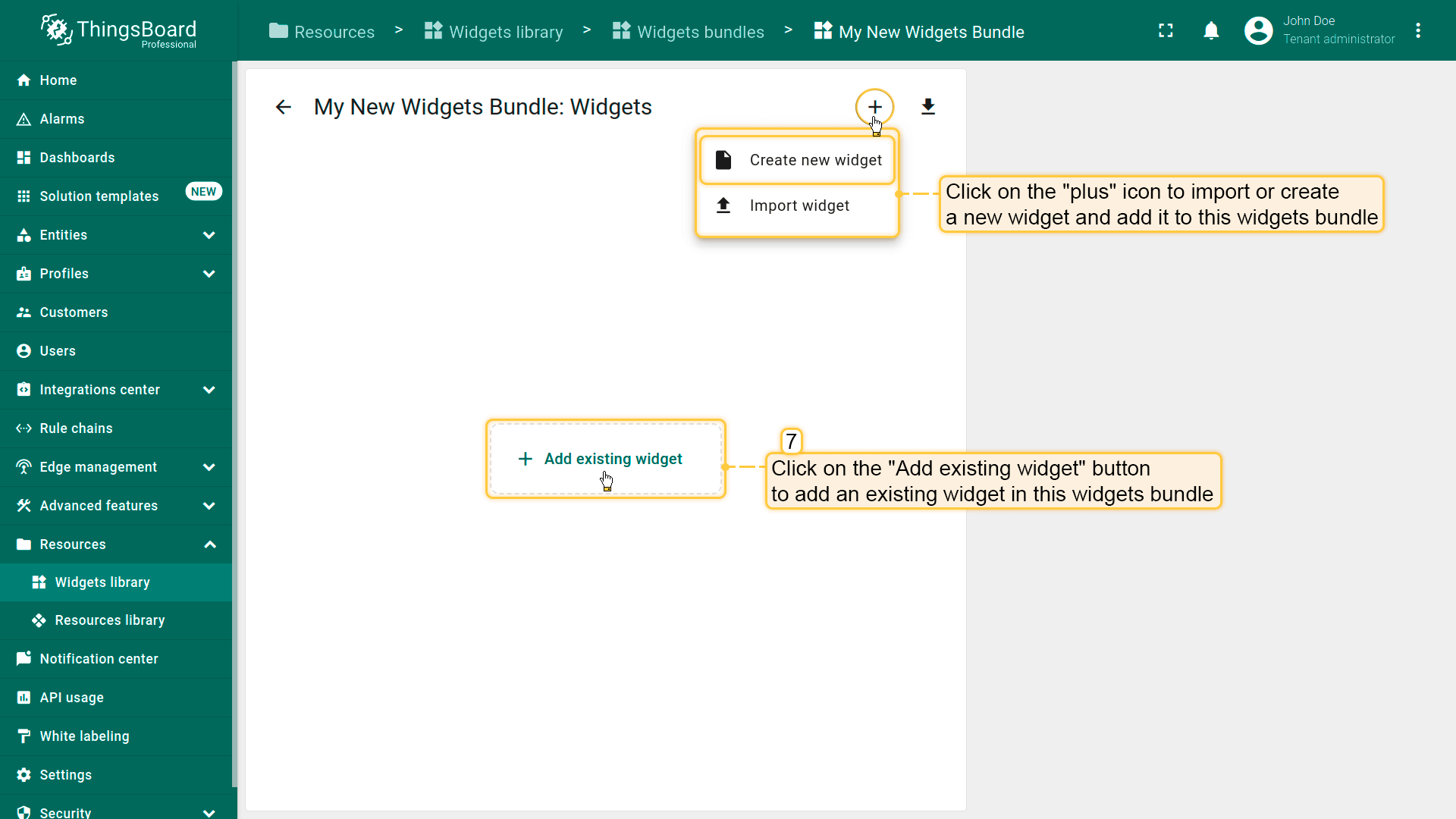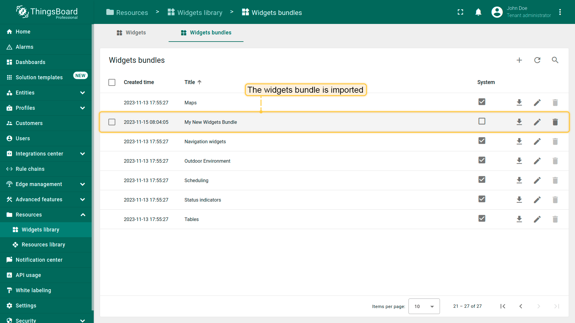 When a system administrator adds a new widgets bundle, it automatically becomes a system widgets bundle. It means that only they can delete, edit, and add widget to the bundle. Tenant administrators can create widget bundles as well. In this case, they have permission to modify already created bundles. You can always implement and add your widgets by following this guide.