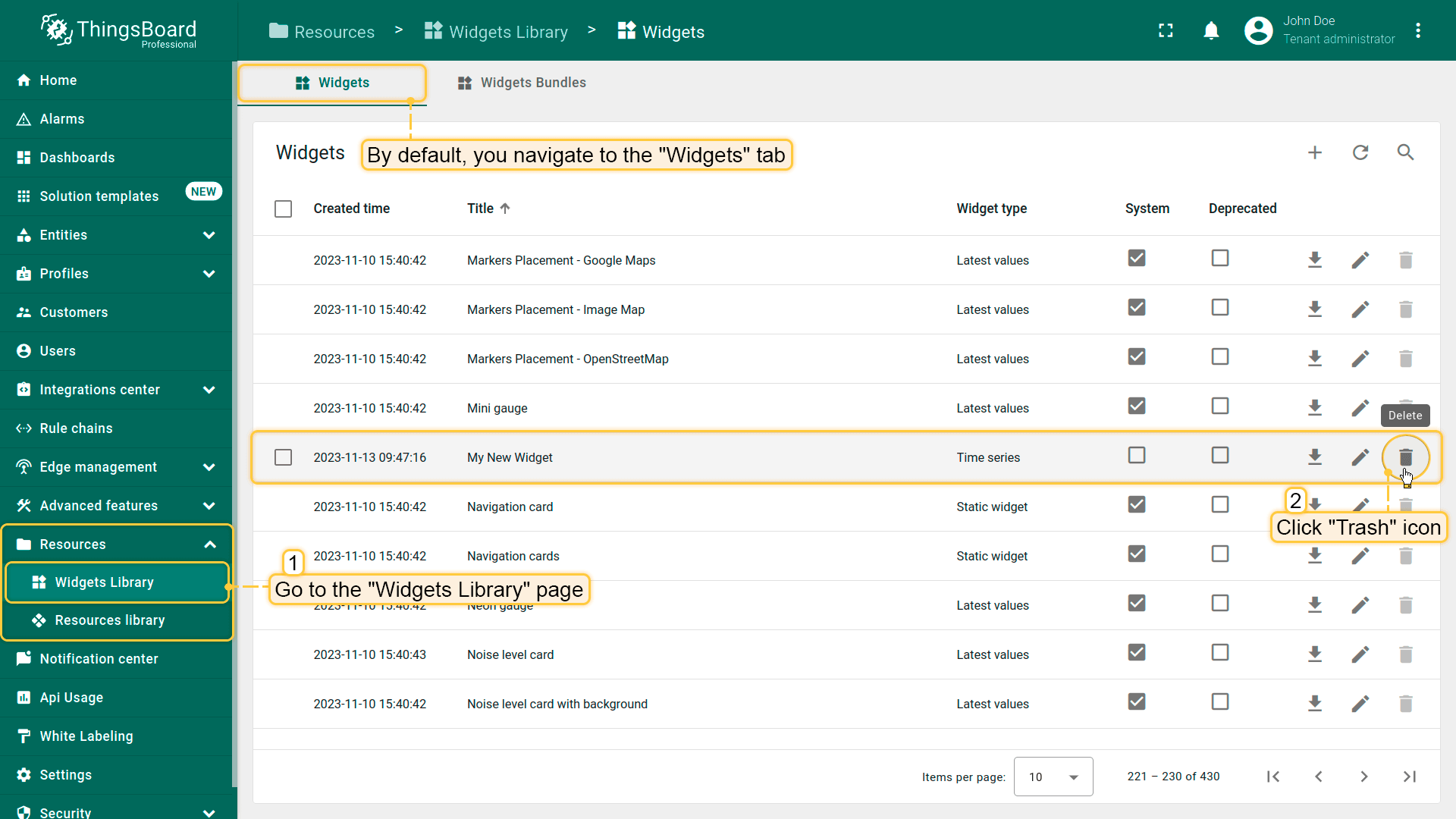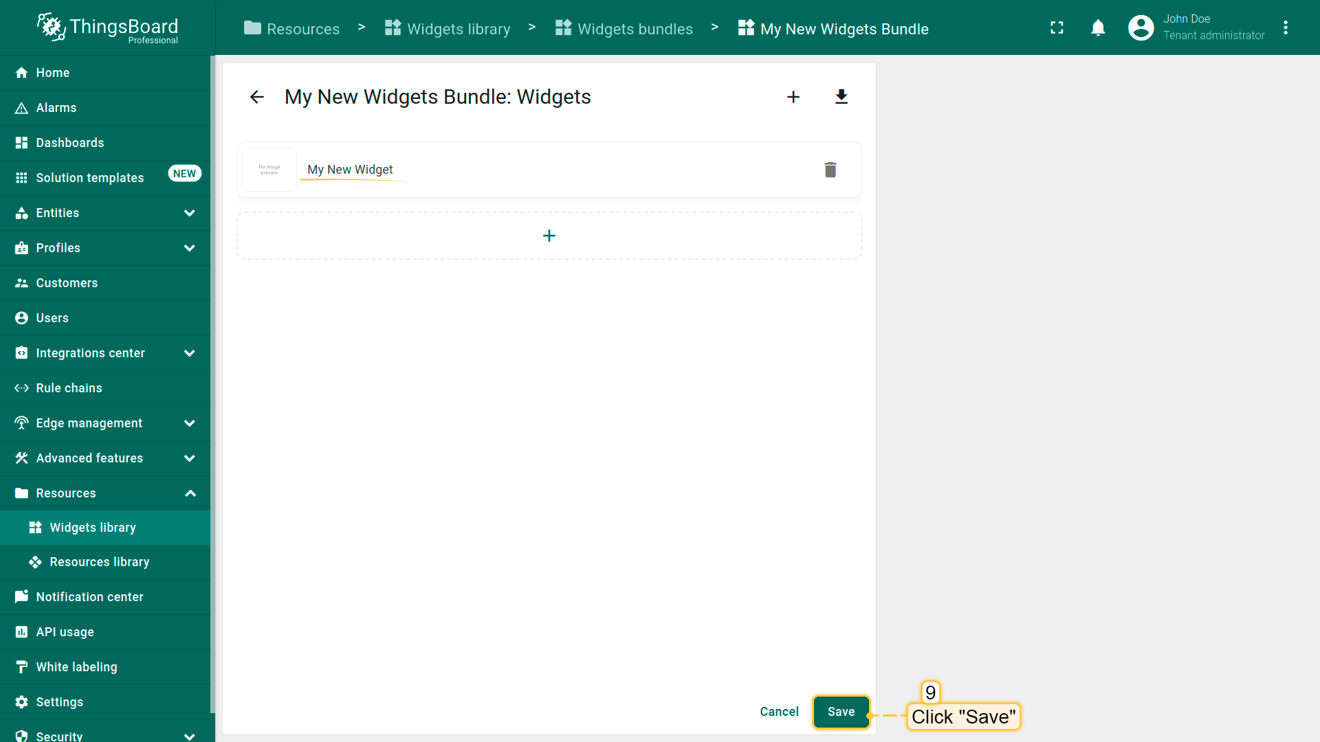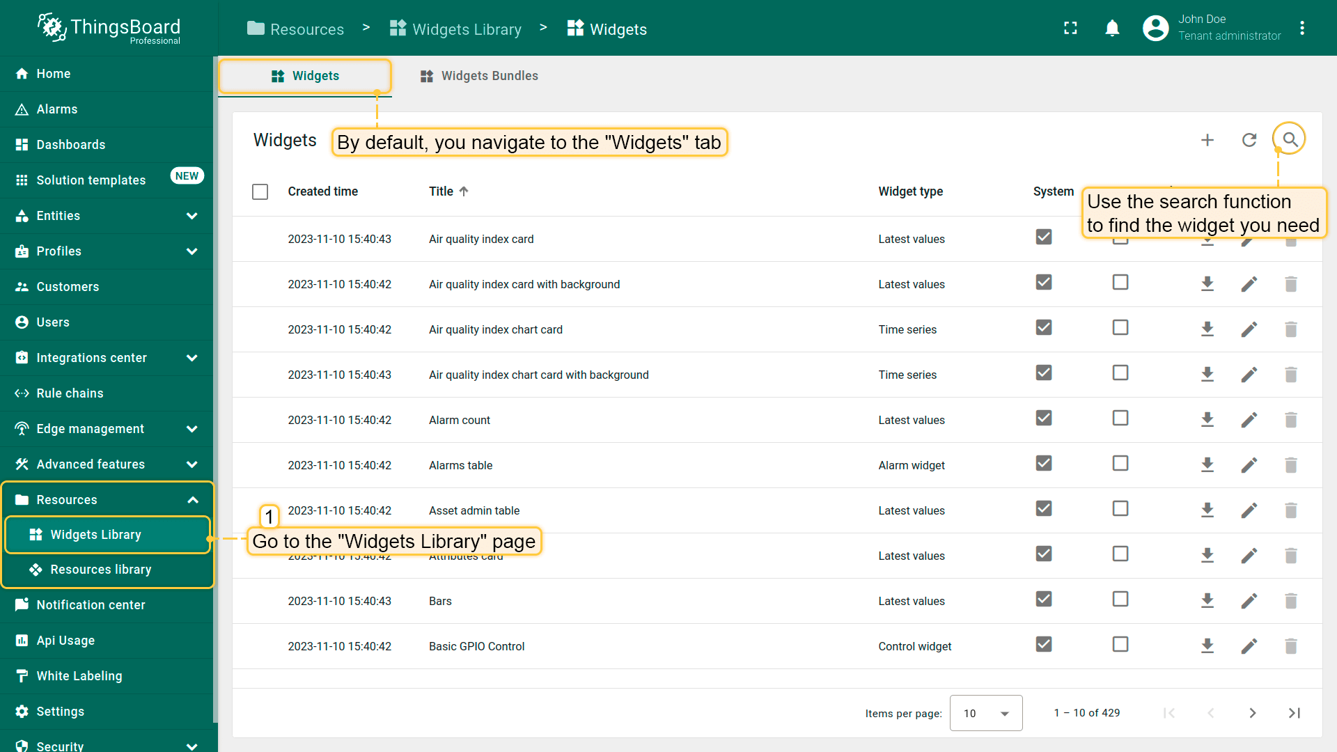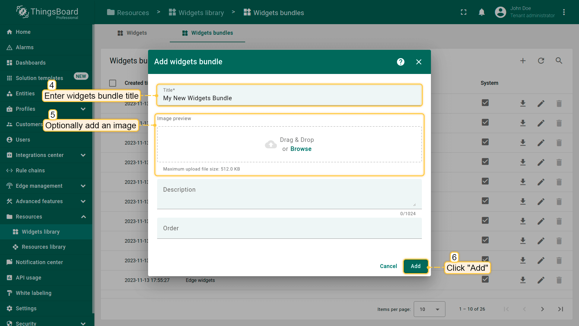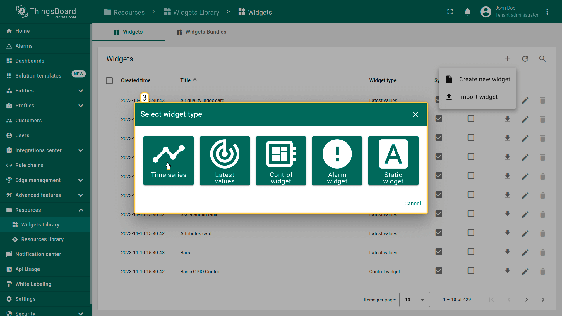 When a system administrator adds a new widgets bundle, it automatically becomes a system widgets bundle. It means that only they can delete, edit, and add widget to the bundle. Tenant administrators can create widget bundles as well. In this case, they have permission to modify already created bundles. You can always implement and add your widgets by following this guide.