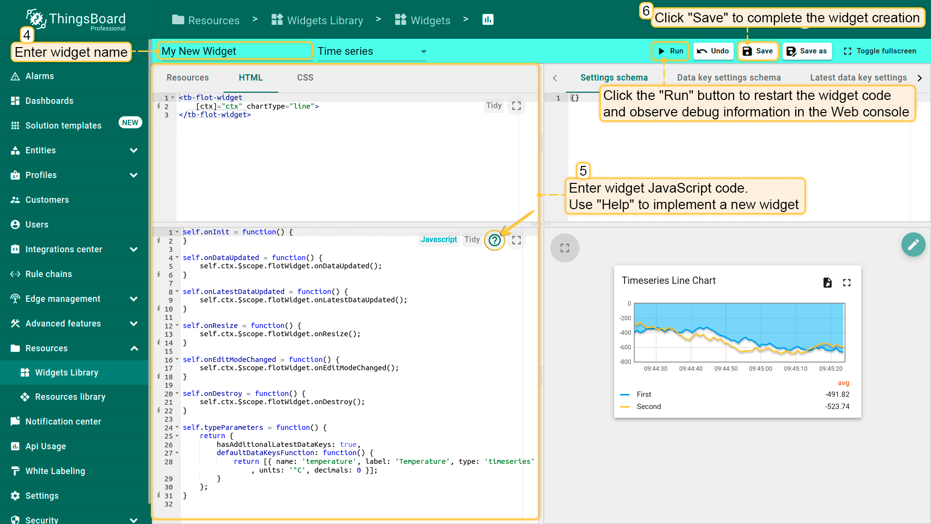 - Function - this data source type is used in both time series and latest values widgets for debugging. Basically, you can specify a JavaScript function that will simulate data from a device in order to set up visualization.