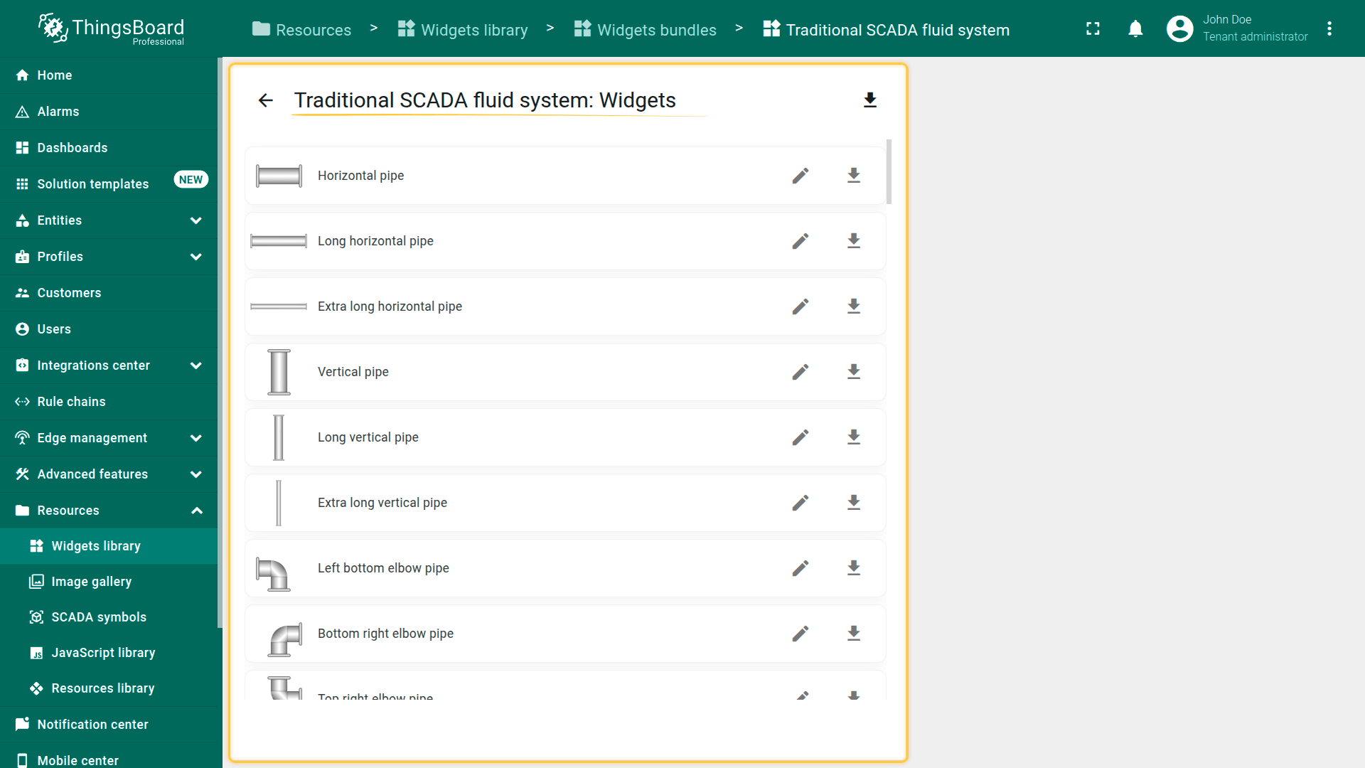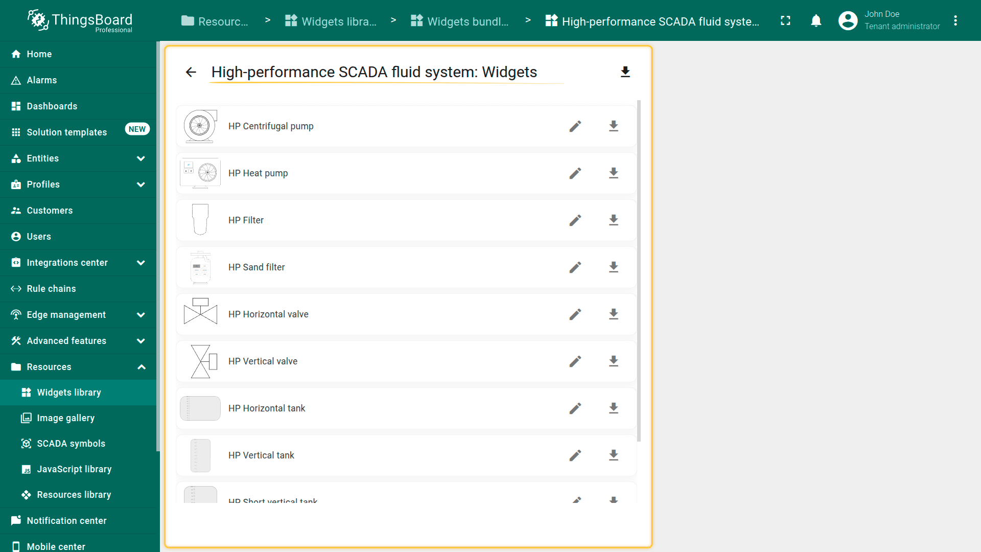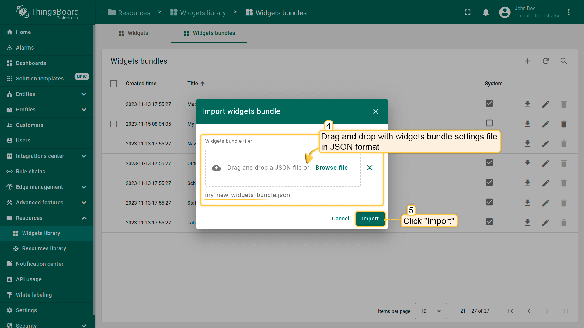 Please note that only system administrators can modify system (default) widgets. This includes the ability to edit, delete, add, or import widgets within the bundle. When a system administrator creates a new widget bundle, it’s set as a system-level item for tenants, preventing them from modifying it. Nevertheless, tenants can add their own widgets. In this case, they have full rights to manage created widget types inside the bundle.