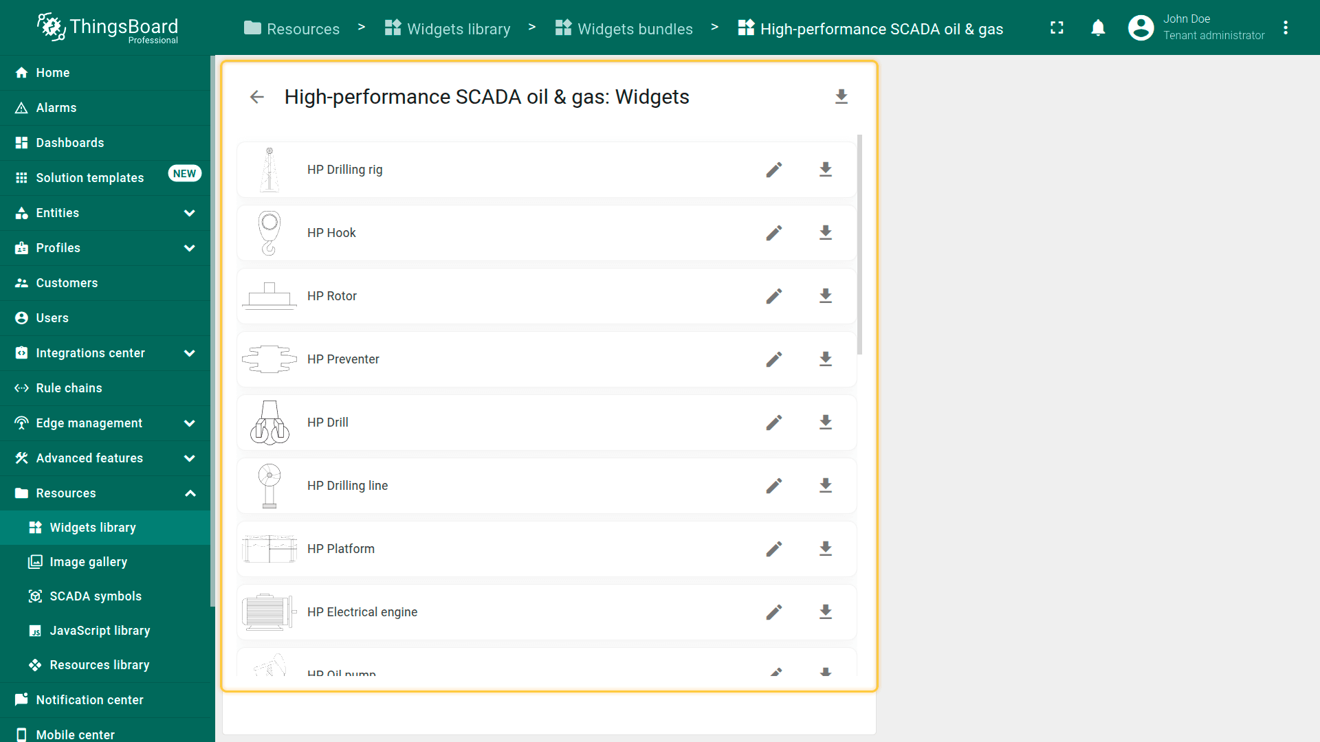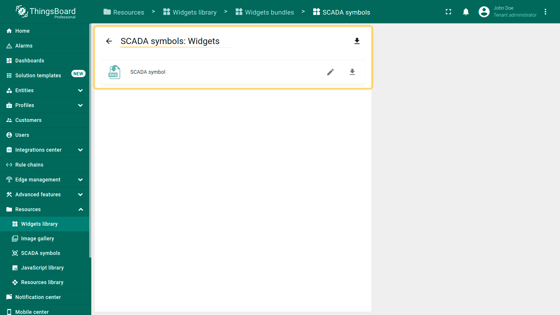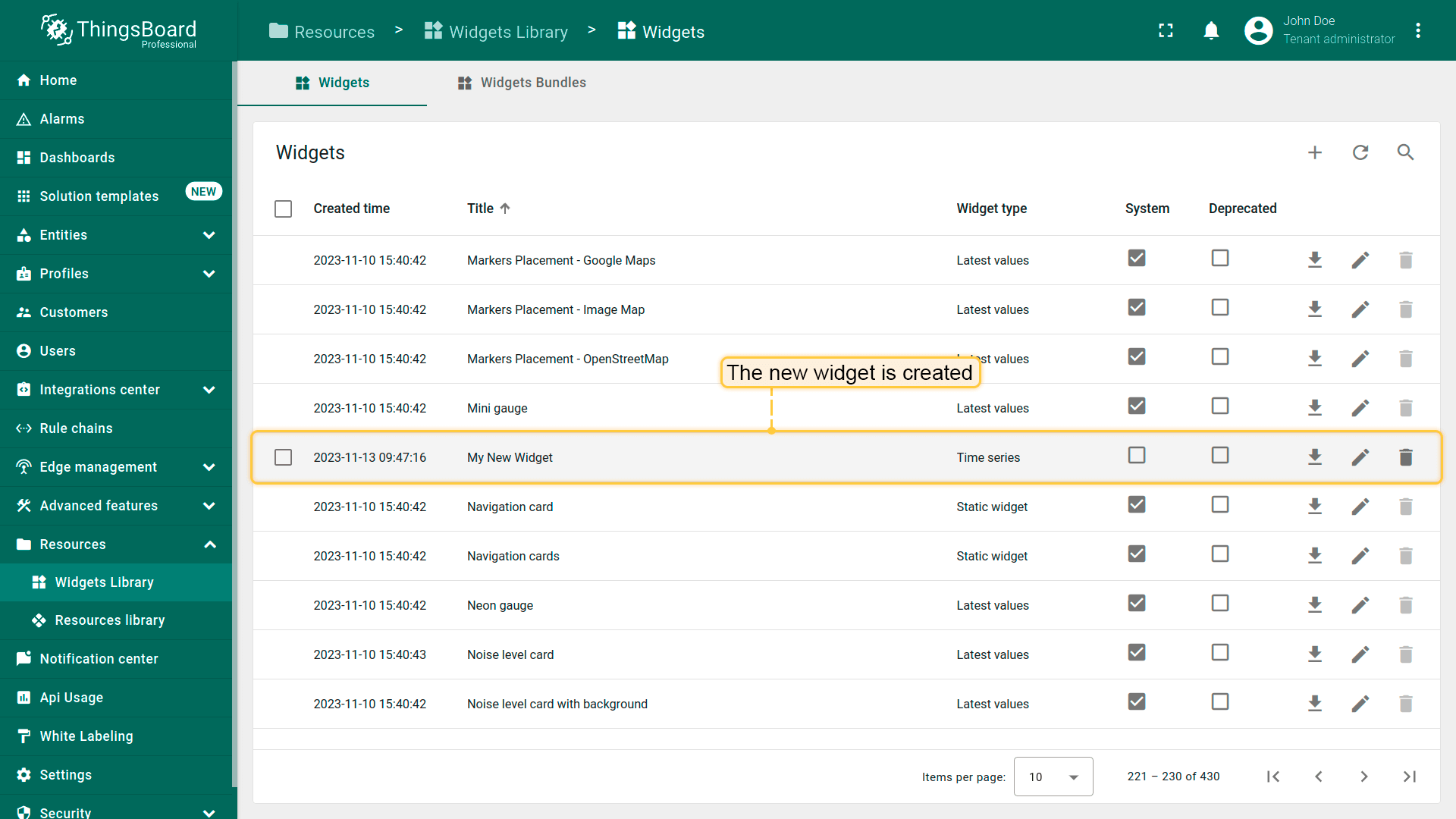 Please note that only system administrators can modify system (default) widgets. This includes the ability to edit, delete, add, or import widgets within the bundle. When a system administrator creates a new widget bundle, it’s set as a system-level item for tenants, preventing them from modifying it. Nevertheless, tenants can add their own widgets. In this case, they have full rights to manage created widget types inside the bundle.